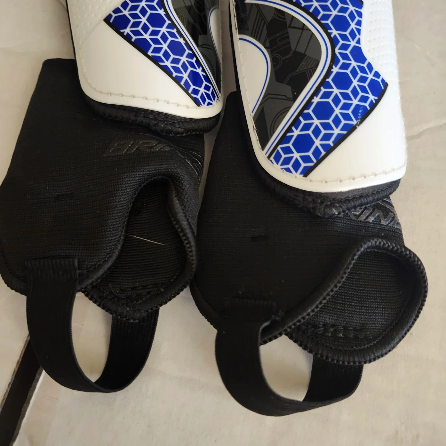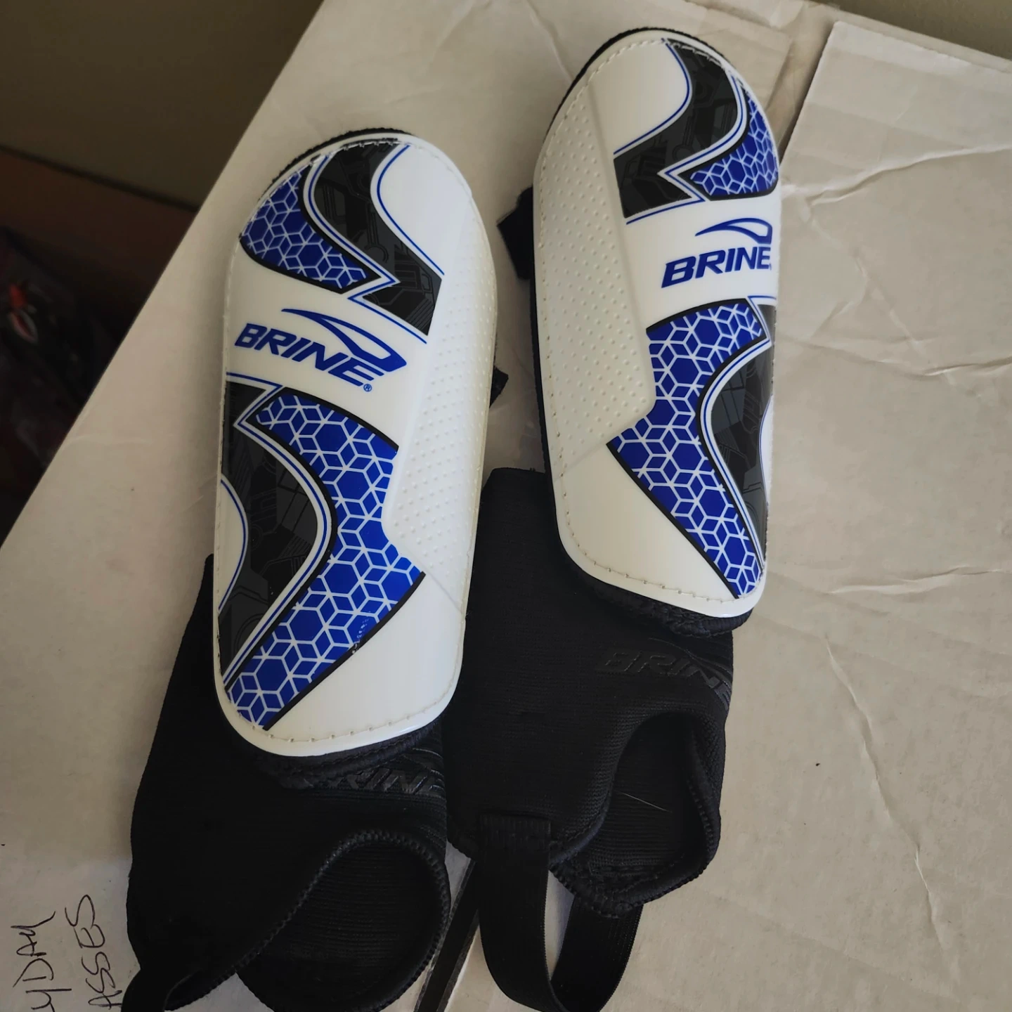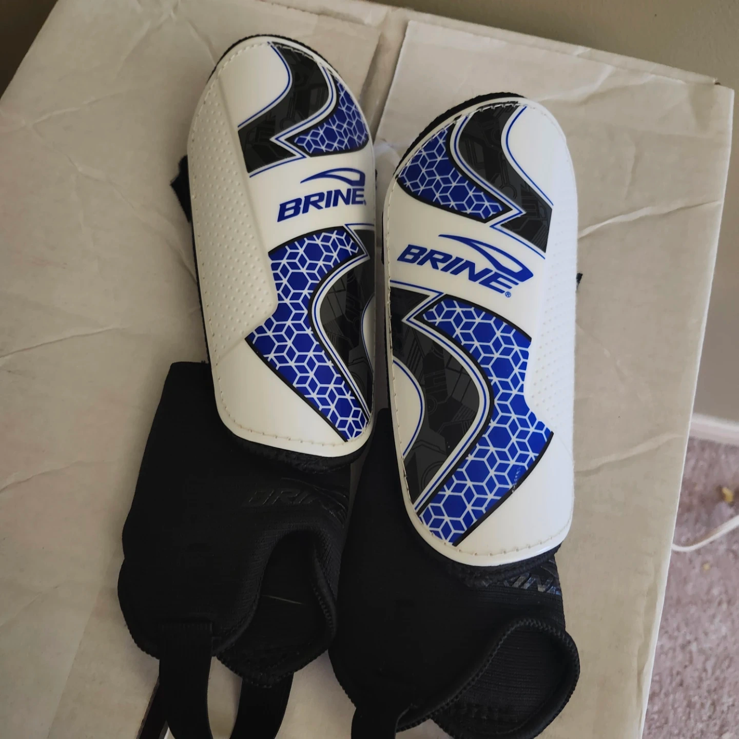 Selling a pair of Brine shin guards. They are white, blue, and black and in good condition. Perfect for protecting your shins during games or practice!