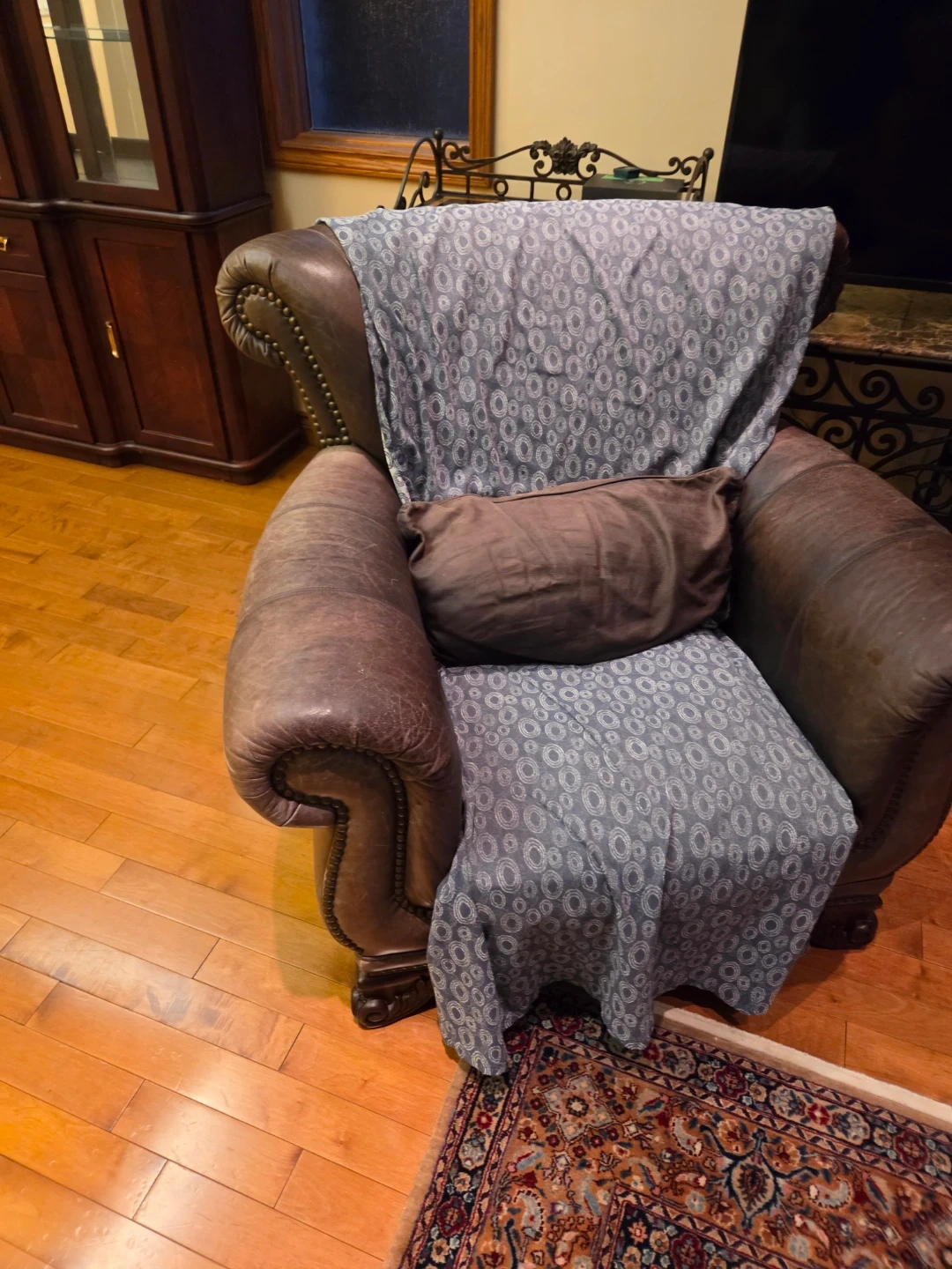 Selling a leather armchair. It has a brown cushion and a patterned throw over it. It's in good condition and would be a great addition to any living room or den