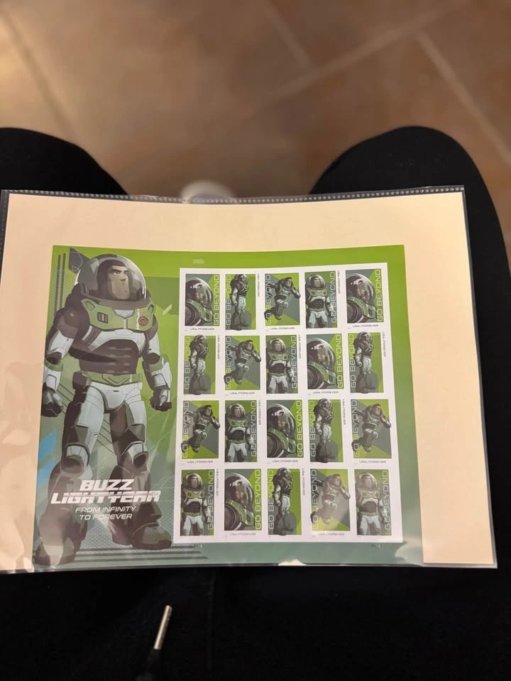 Buzz Lightyear USPS Forever stamp sheet featuring the “Go Beyond” design. This is a full pane and includes a noticeable printing variation where the usual side inscription is missing on part of the sheet. Unused, original condition, stored flat in a protective sleeve. Great Disney or USPS collectible, especially for anyone interested in modern printing errors or variants.( see photos)