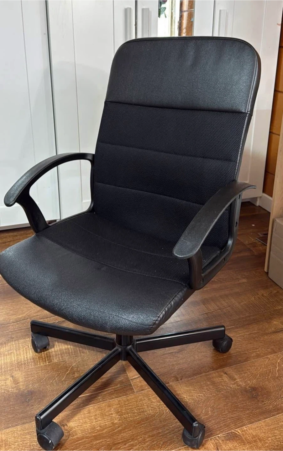 Selling a black IKEA office chair and a light wood desk set. Both are in good condition and ready for a new home office setup! The chair is comfortable for long hours, and the desk offers ample workspace