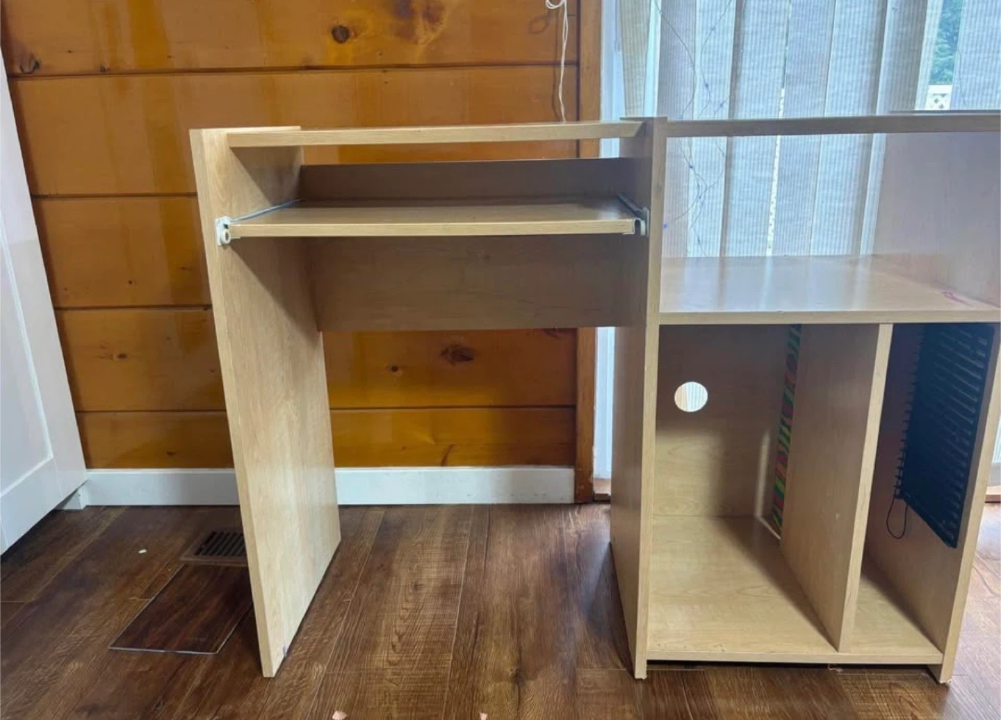 Selling a black IKEA office chair and a light wood desk set. Both are in good condition and ready for a new home office setup! The chair is comfortable for long hours, and the desk offers ample workspace