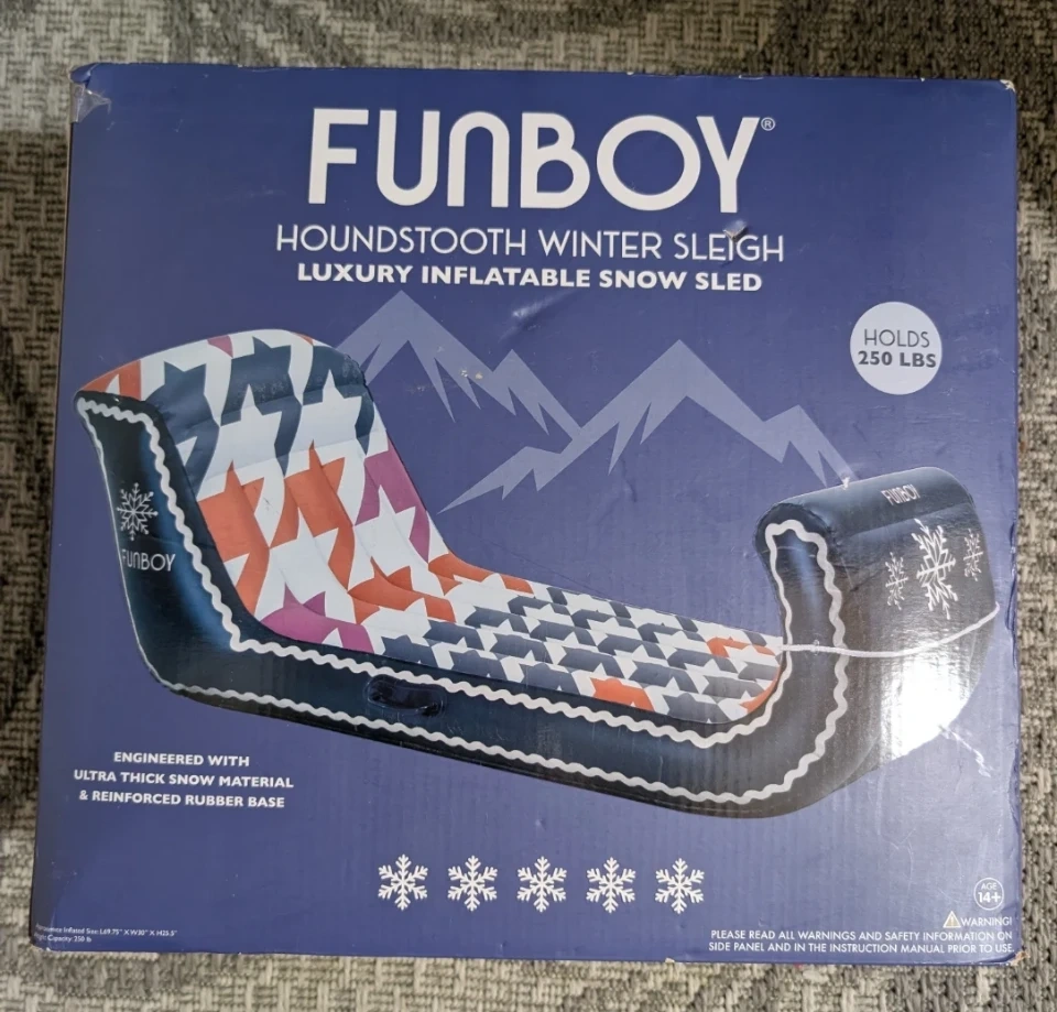 Selling a brand new FUNBOY Houndstooth Winter Sleigh! It's a luxury inflatable snow sled, still in its original box. This sled is engineered with ultra-thick snow material and a reinforced rubber base. It can hold up to 250 lbs and features dual handles and a pull rope for easy maneuvering on the snow.