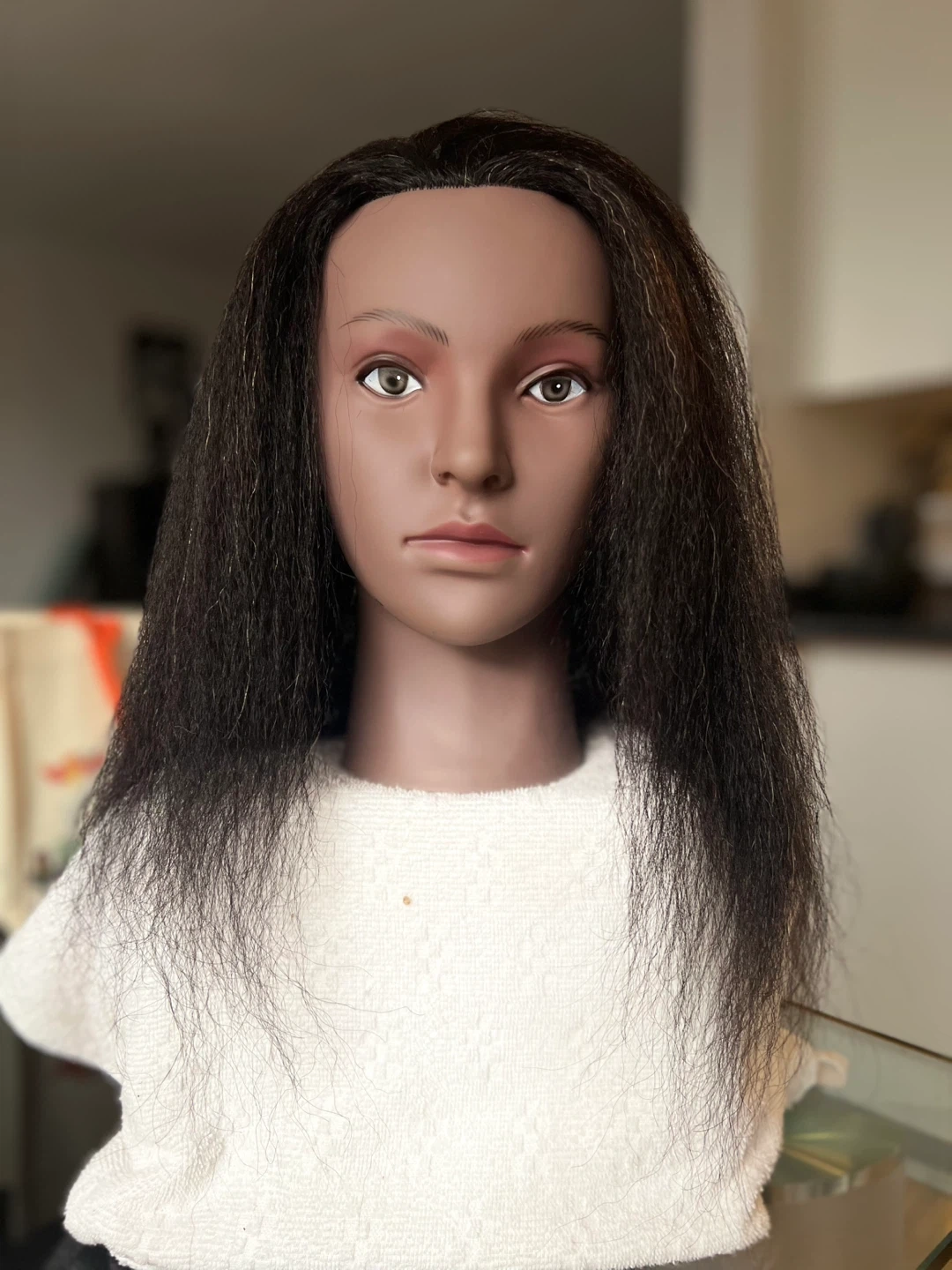 High-quality mannequin head with realistic facial features and textured, dark hair. Ideal for braiding practice, wig making, styling, cutting, or cosmetology training. Hair is securely rooted and suitable for sectioning and styling.