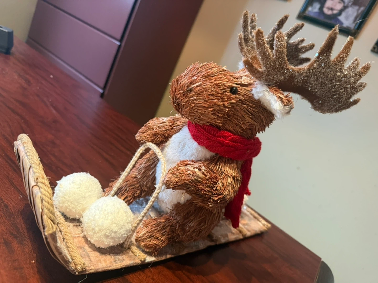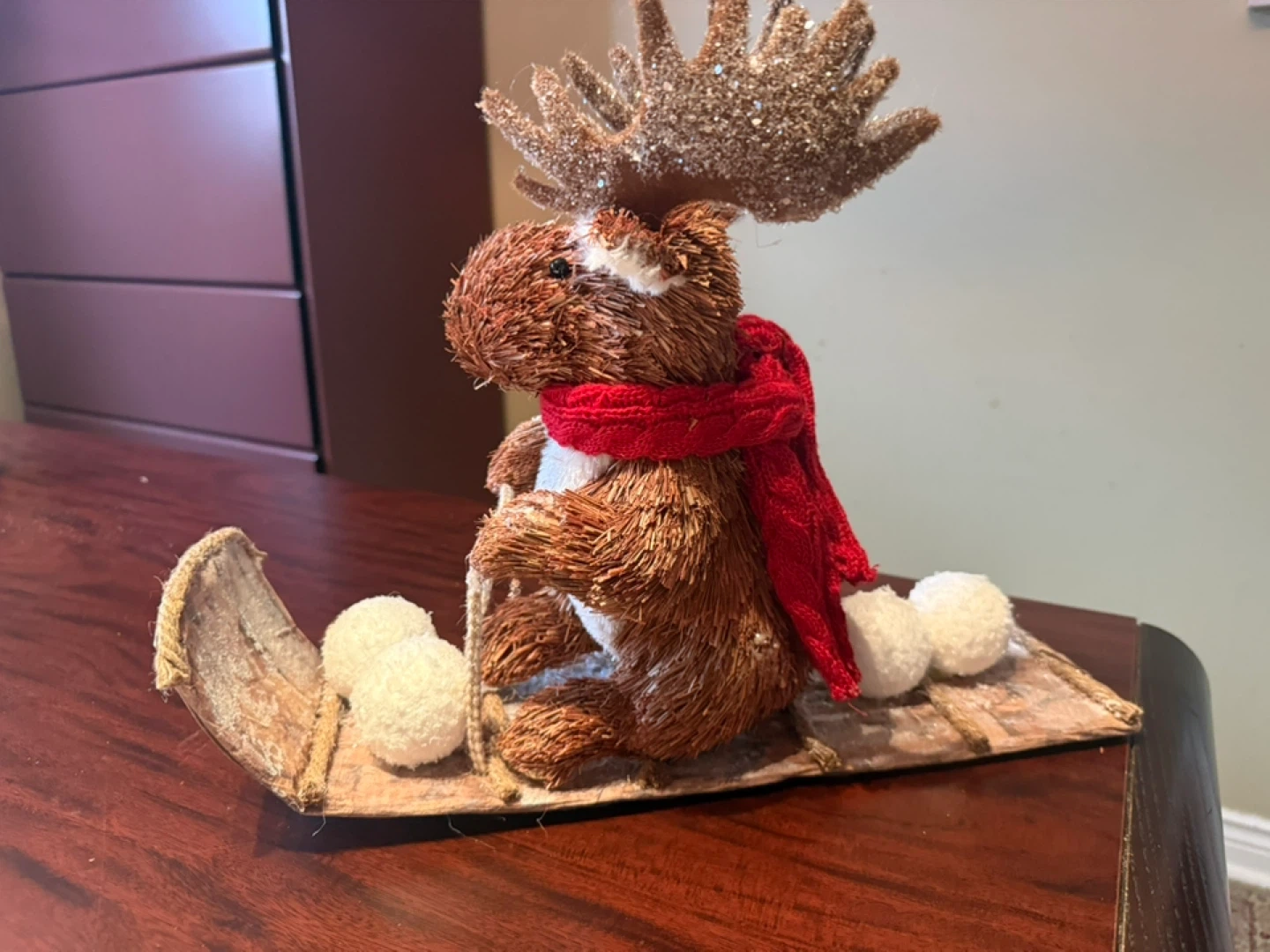 A charming moose on a sled, ready to add some festive cheer to your home this holiday season! The moose is wearing a red scarf and has glittery antlers. It's a cute and cozy addition to any Christmas display