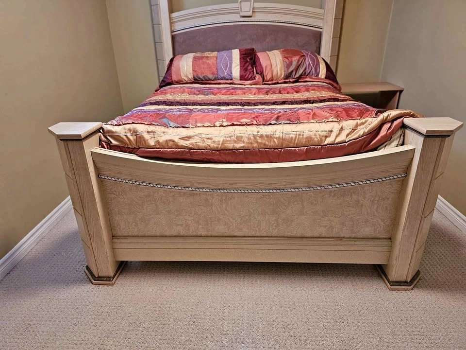Ashley Ashton Castle Queen Poster Bed inspired by the majestic architecture. Featuring a plush, padded headboard. Made of hardwood color beige. Mattress is included.