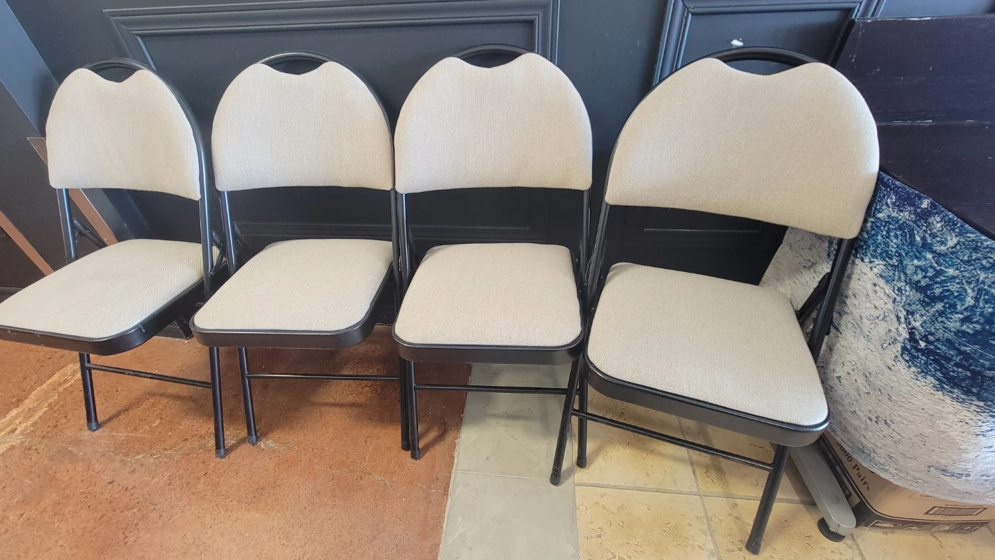 Selling a set of four folding chairs. They're in great shape and ready to be used for your next gathering or event! The chairs feature a neutral-coloured seat and back with a black metal frame. They are easy to store when not in use