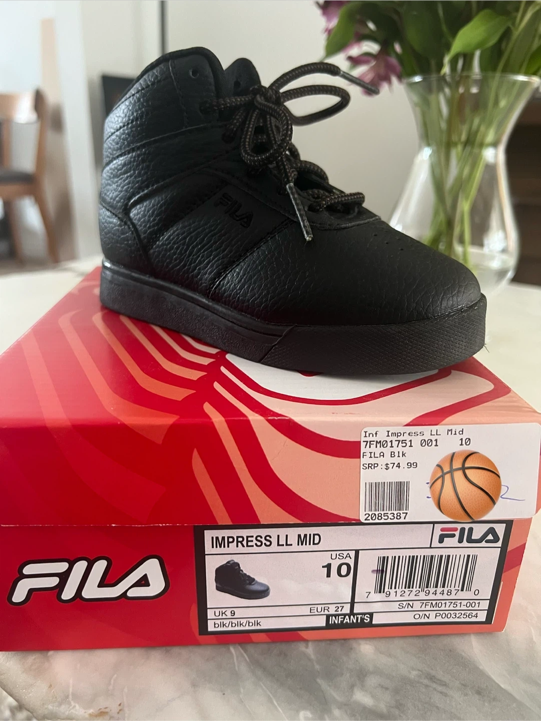 Brand new never worn FILA Impress LL Mid infant shoes in black! They are a size 10 (US). The box is included.