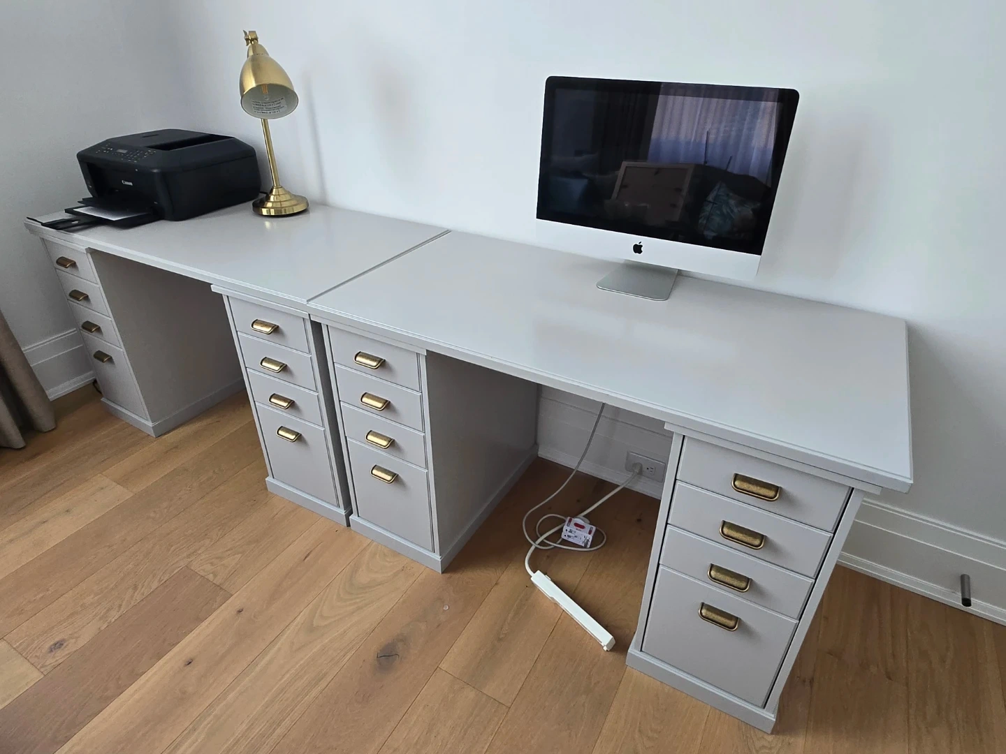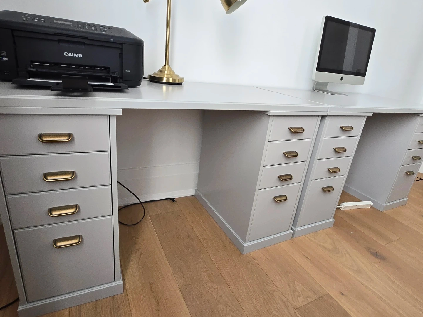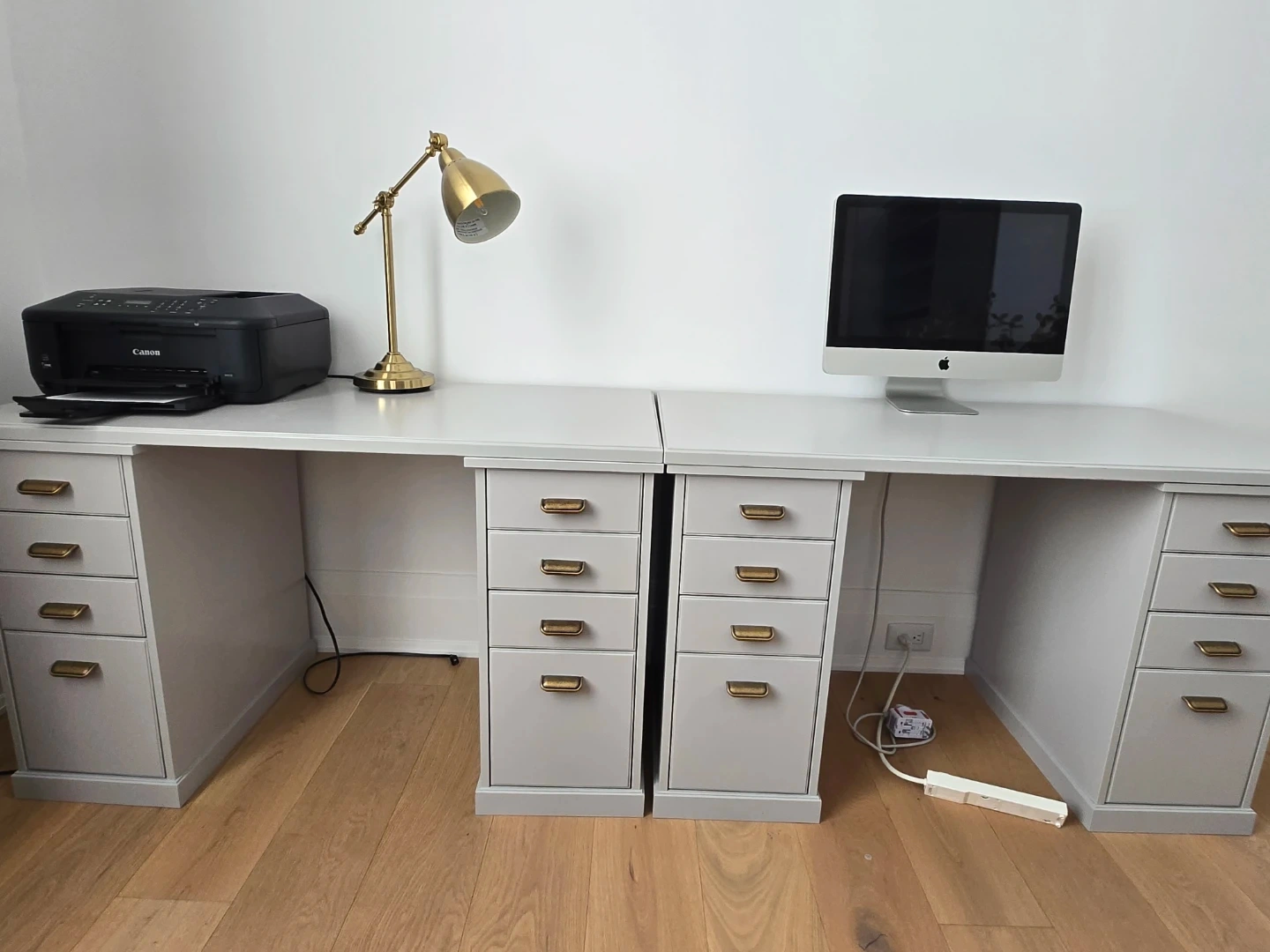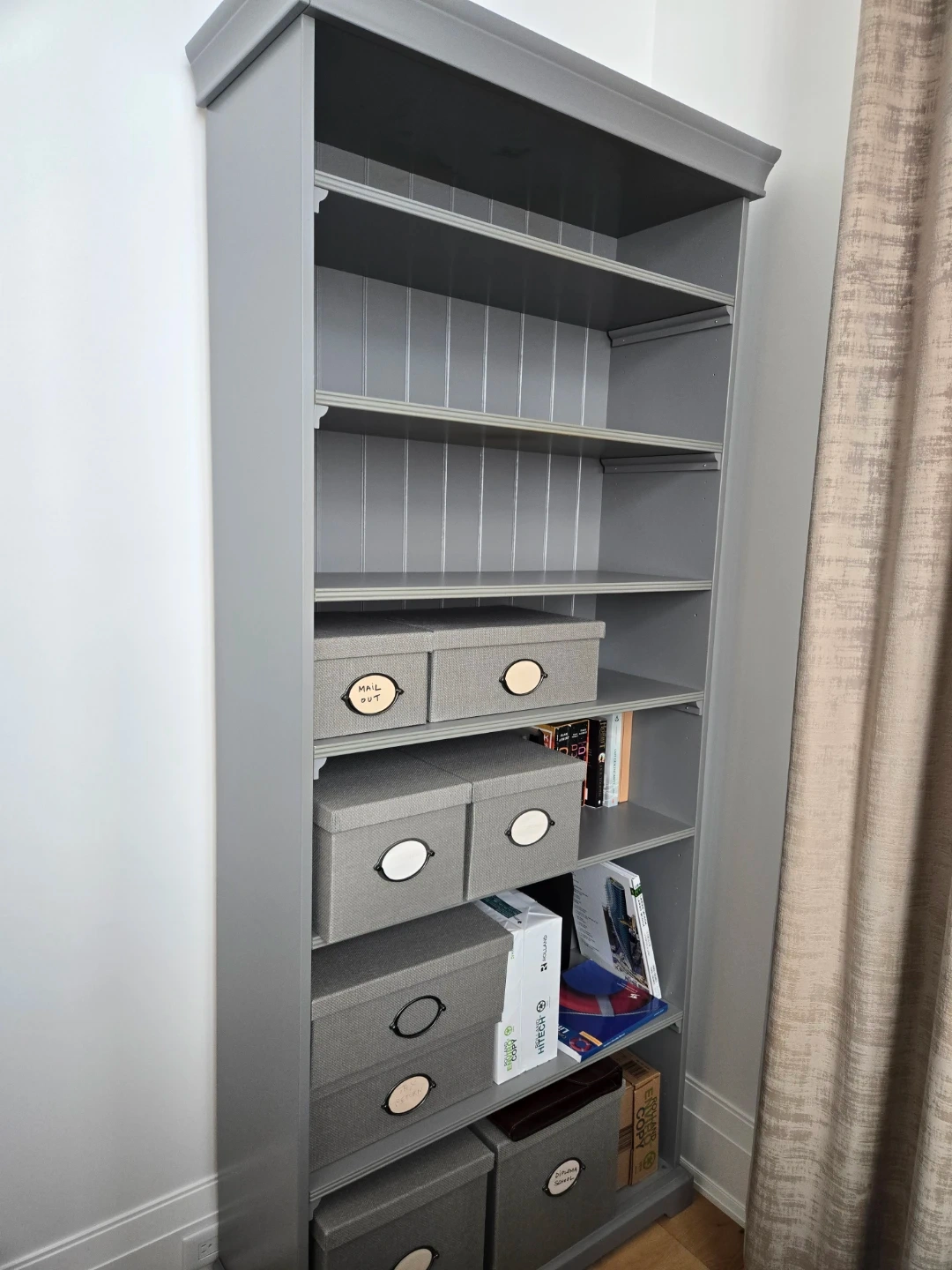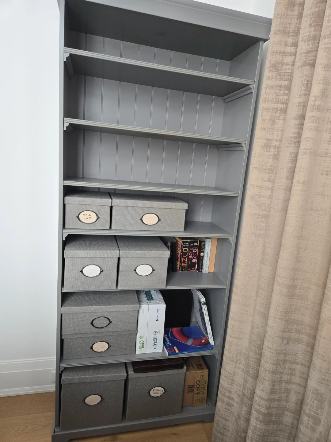 Selling a grey bookshelf and desk set. Great for a home office or study space! The bookshelf has multiple shelves for storage and display. The desk features drawers for organization. Both pieces are in good condition and ready for a new home