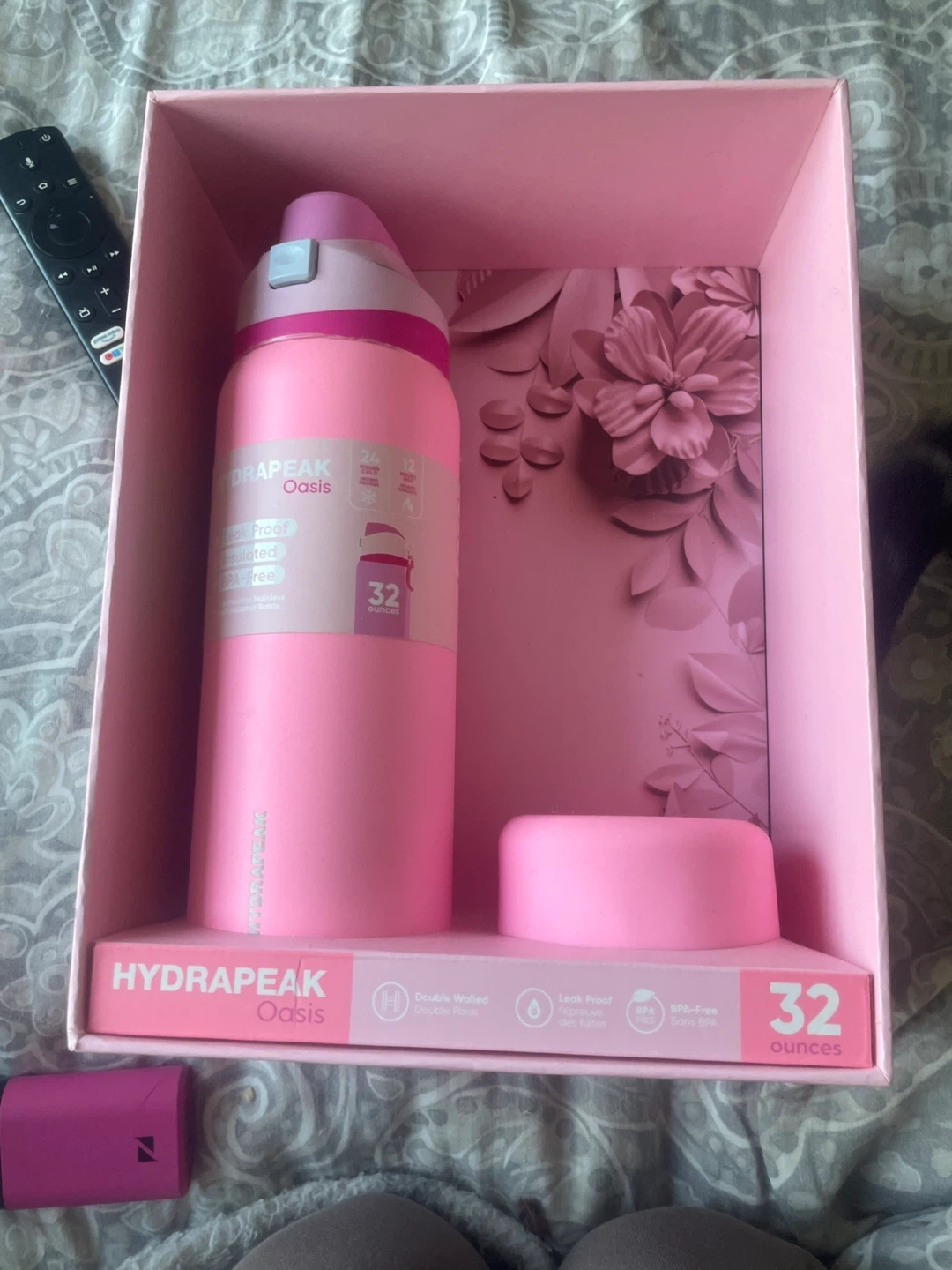 Selling a brand new HYDRAPEAK Oasis water bottle! It's a lovely pink colour and holds 32 ounces. It's double walled and leak proof, plus BPA-free! Comes with the original box