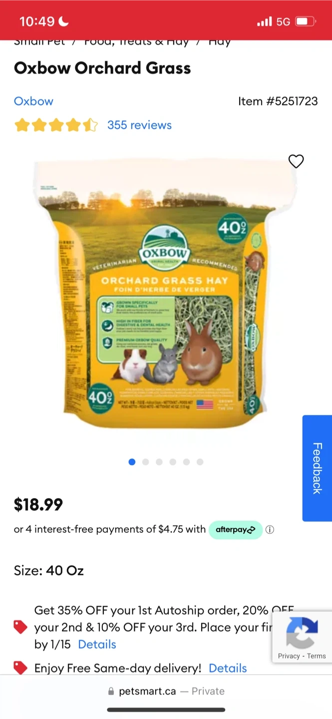 Oxbow Orchard Grass Hay, perfect for small pets! This is a 40 oz bag of premium quality hay, high in fiber for digestive and dental health. Originally bought for $18.99. it’s opened one handful was used but i got the wrong kind