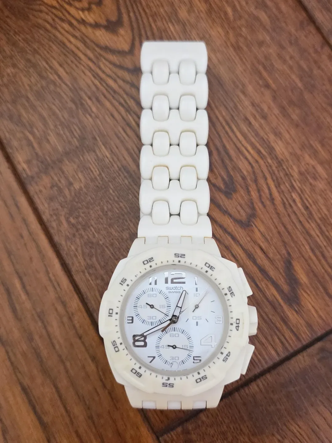 Selling a Swatch watch with a white rubber strap and chronograph features. It's in great shape and ready for a new wrist! The watch has a sporty look and is perfect for everyday wear or casual outings. Needs battery change.