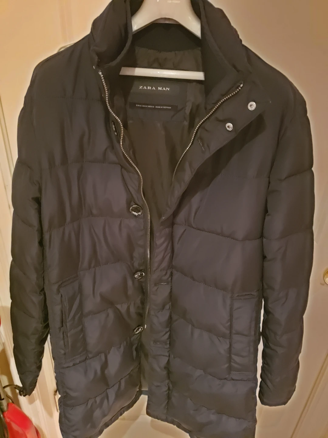Zara Man black puffer jacket in size 40. This jacket is perfect for staying warm during the colder months. It features a zipper and button closure, as well as pockets for added convenience. Great for everyday wear!.. only cash 💸