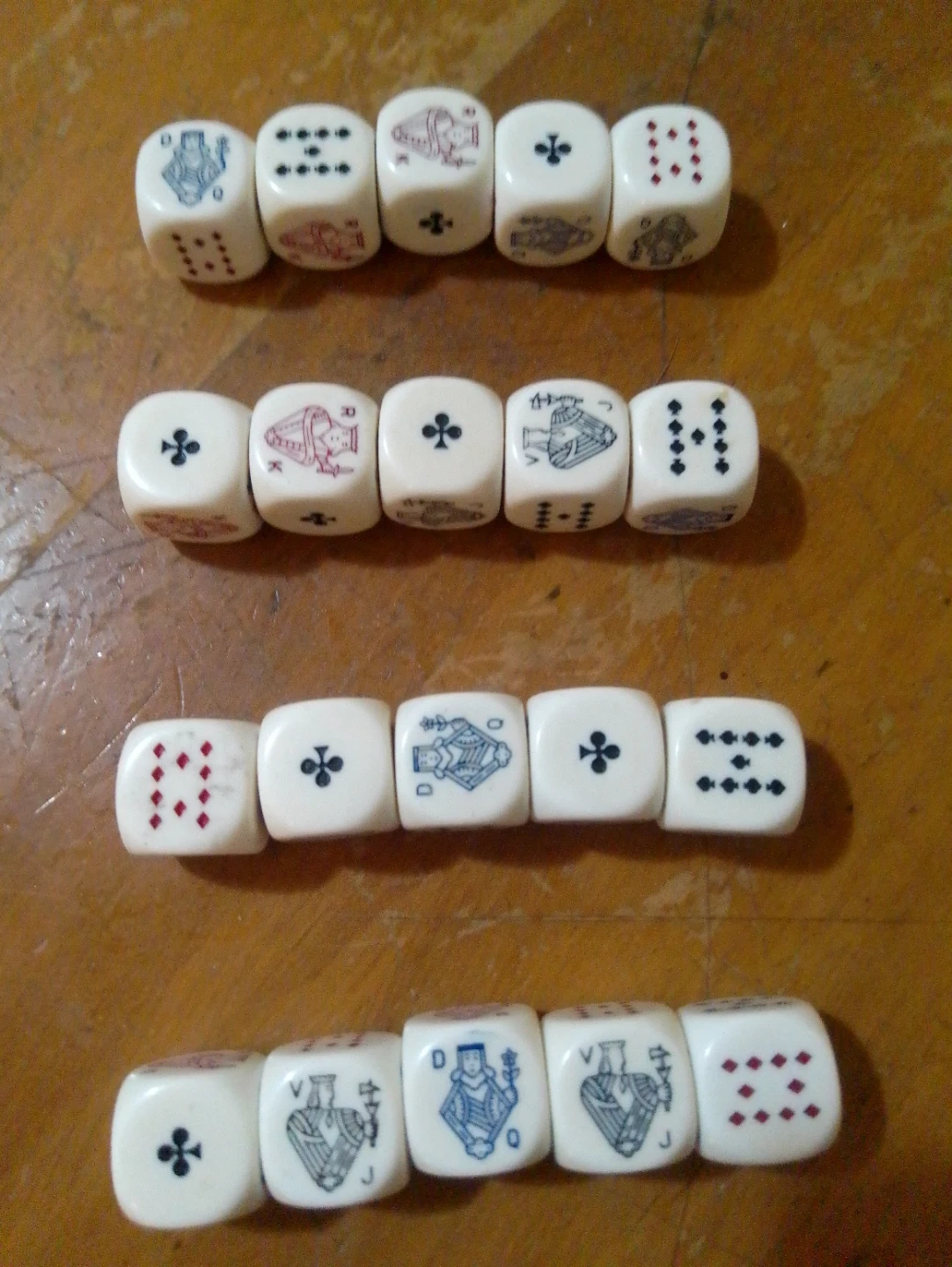 Selling 4 sets pf vintage poker dice! Purchased in 1982 from Shefeild and Sons. These dice have card symbols instead of numbers, making them fun for poker-themed games and activities . Sold by each set.