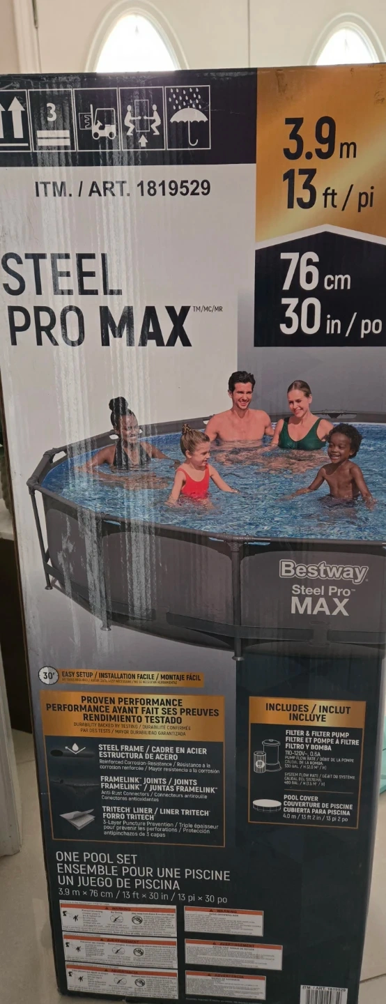 Selling a brand new Bestway Steel Pro Max pool set! This is a one pool set, measuring 3.9 meters (13 ft) in diameter and 76 cm (30 in) in height. It's ready for water in just 30 minutes!