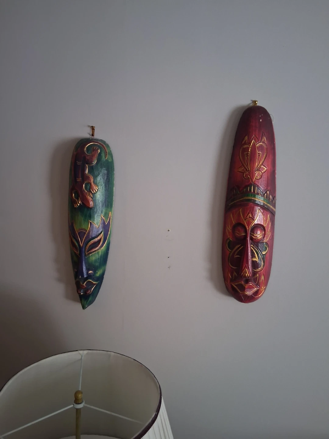 Selling two hand-carved wooden masks. One is green with a lizard design, and the other is red with a face design. They add a unique touch to any room! $30 each