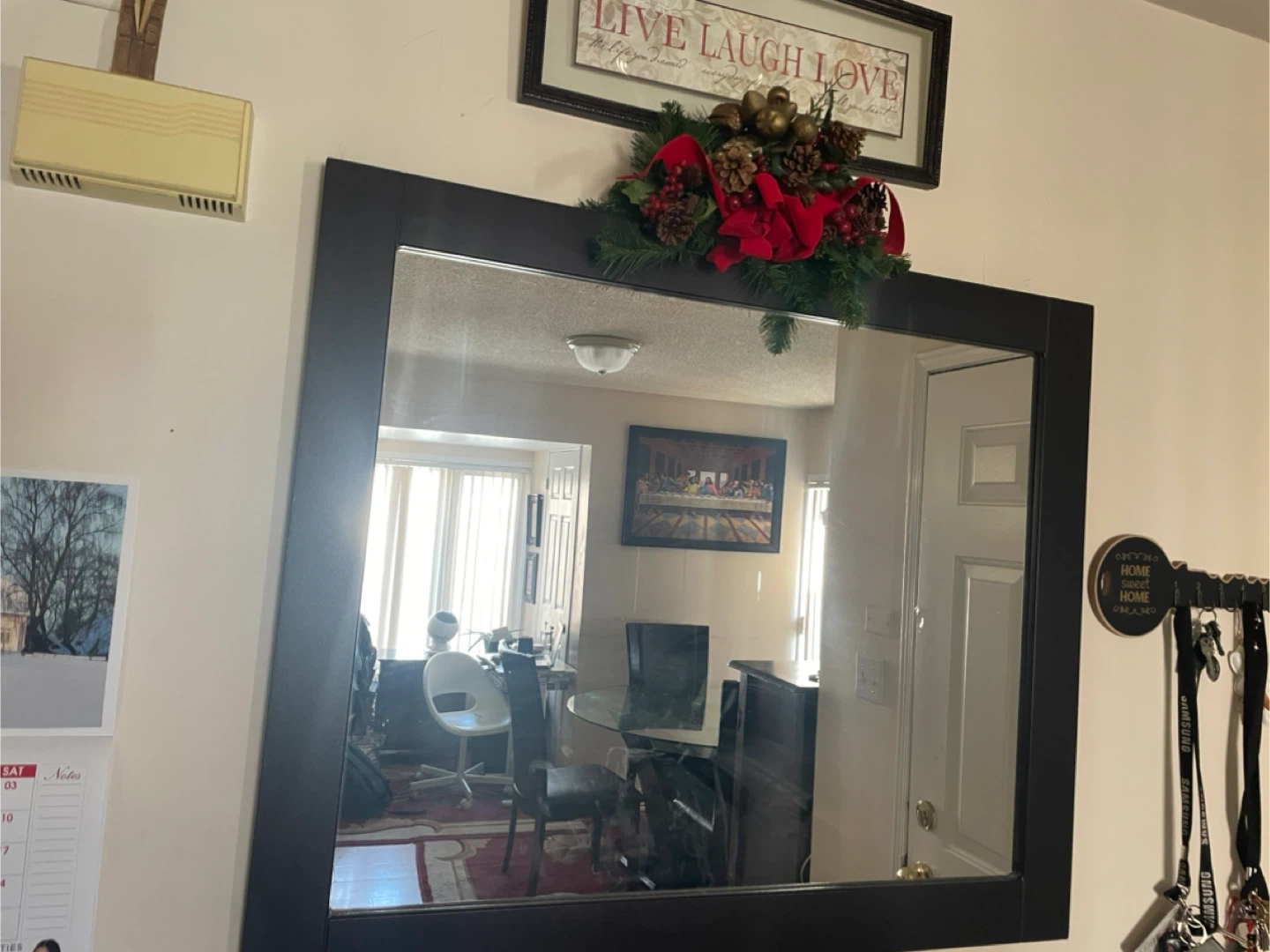 Selling a large framed wall mirror. It's in great shape and ready to brighten up your space! Dimensions are approximately 76cm x 89cm