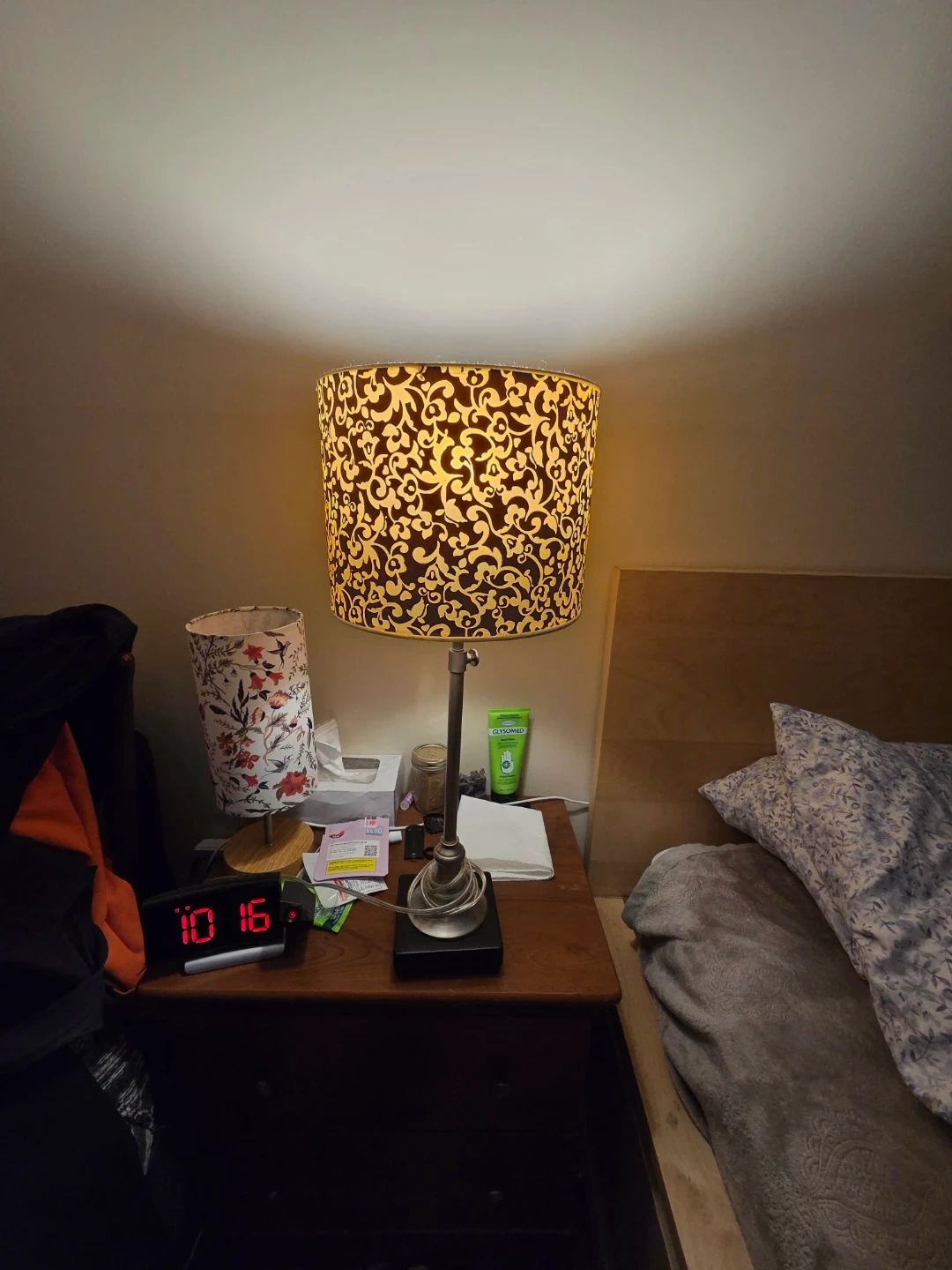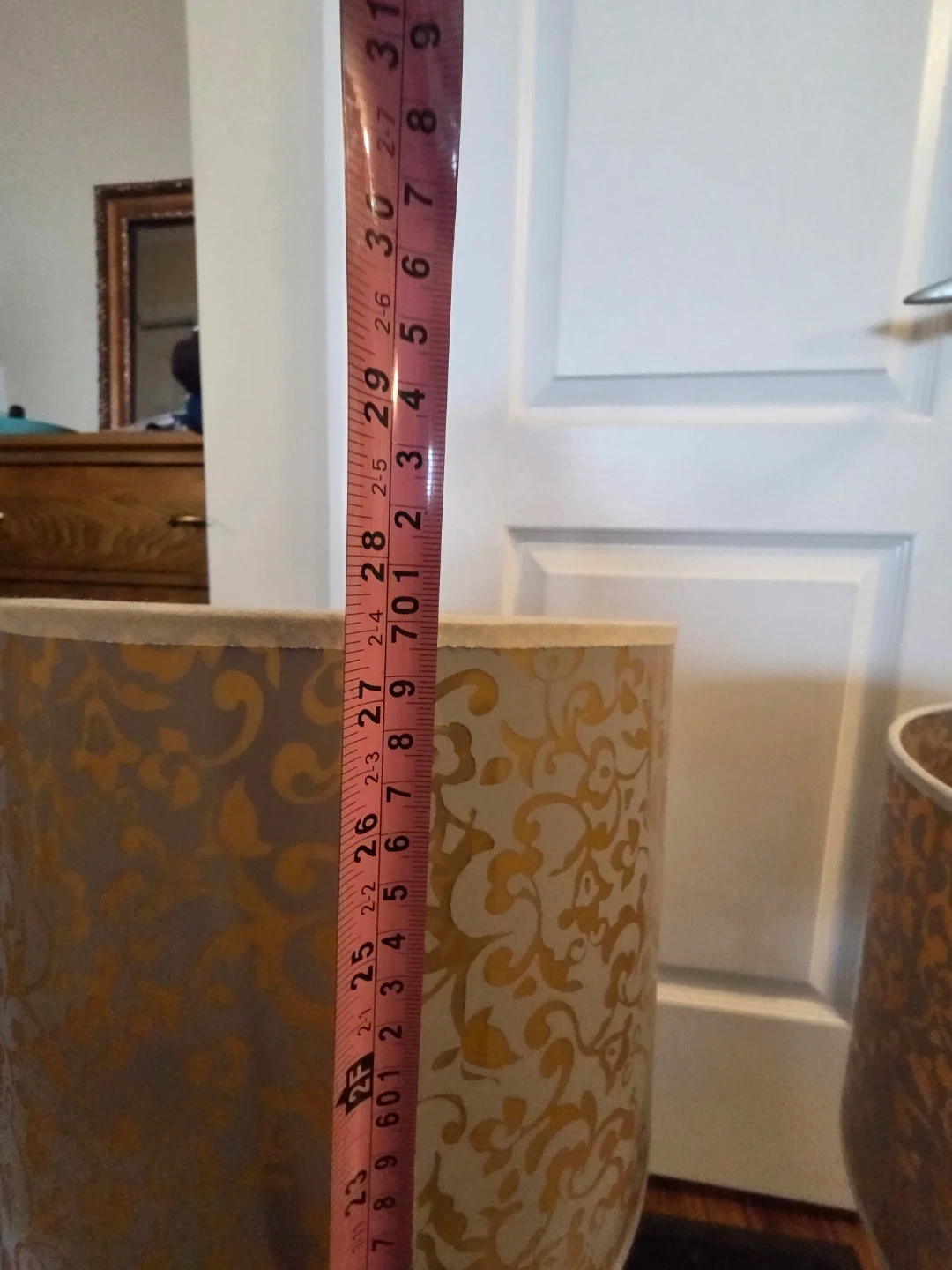 Selling a matching set of table lamps! They have a beautiful gold pattern on the shades. The lamps stand approximately 31 inches tall, and the shades are about 10 inches in diameter. The lamps are adjustable by 2". They'd be a lovely addition to any room