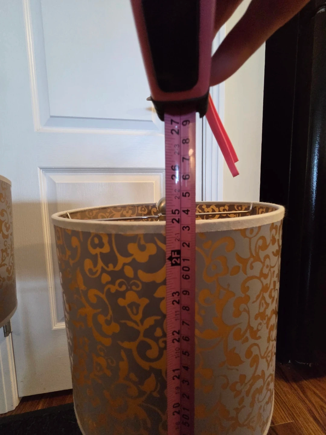 Selling a matching set of table lamps! They have a beautiful gold pattern on the shades. The lamps stand approximately 31 inches tall, and the shades are about 10 inches in diameter. The lamps are adjustable by 2". They'd be a lovely addition to any room