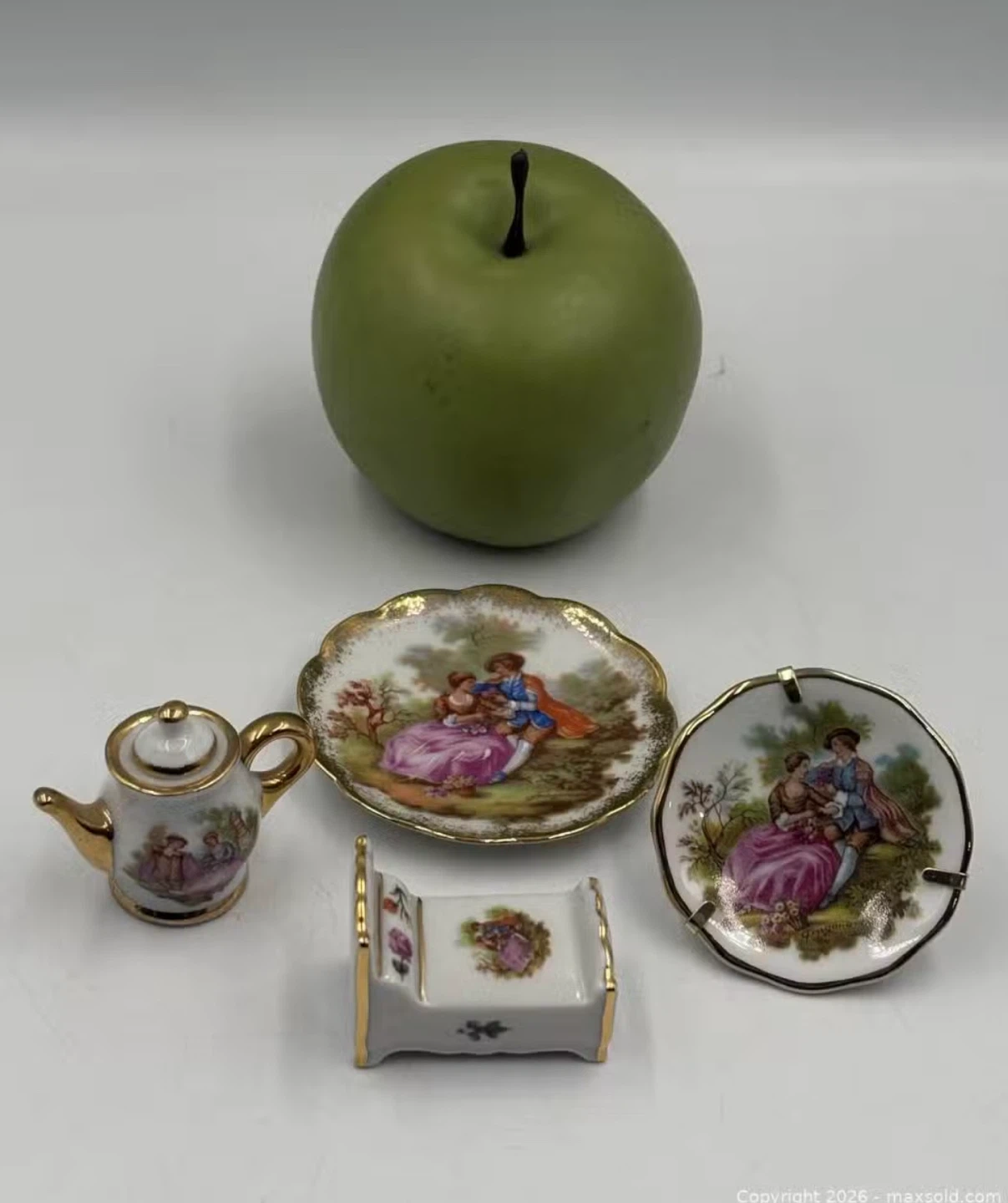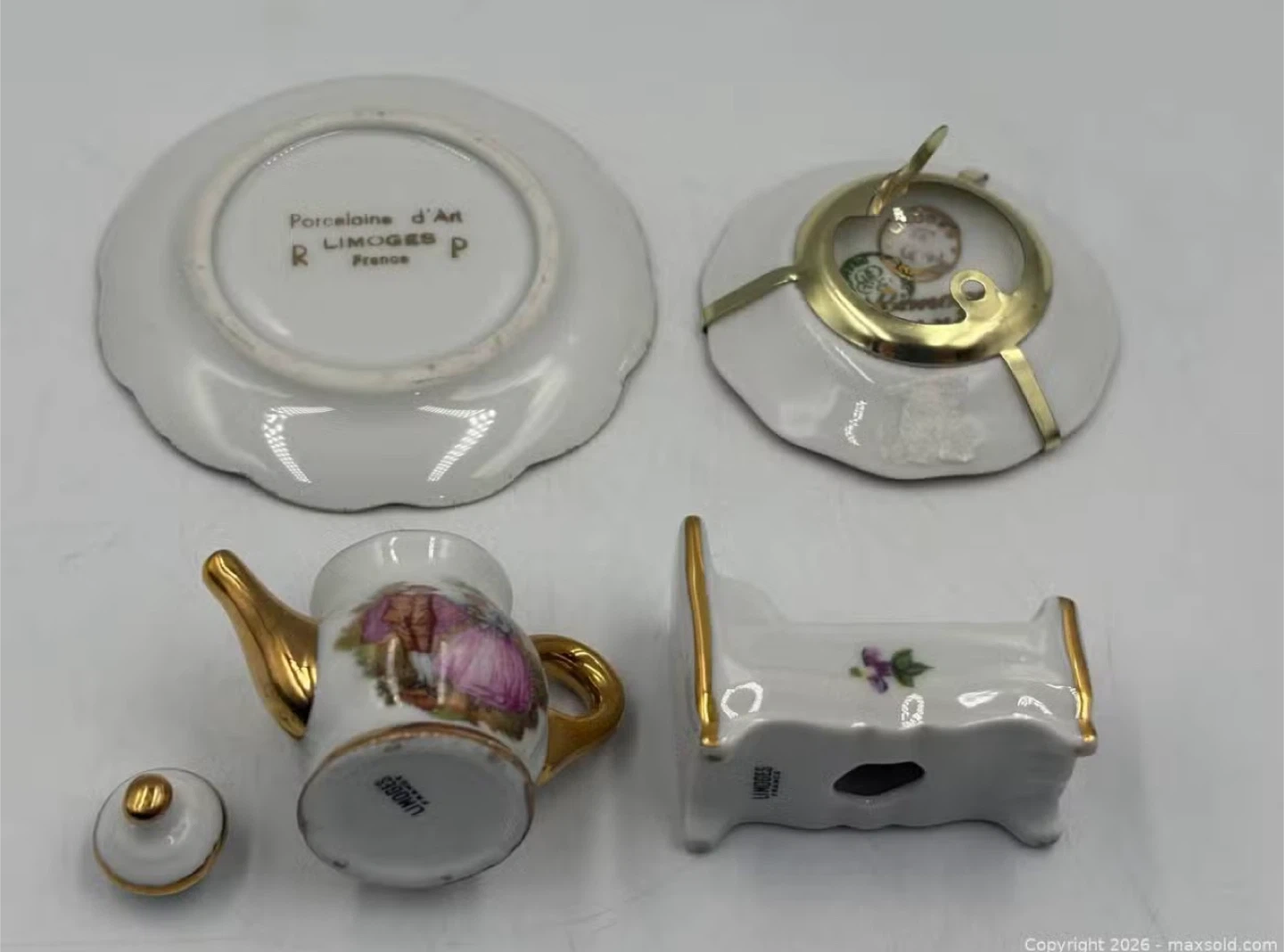 Selling a charming miniature porcelain tea set by Limoges! This set includes a teapot, a small bed, and two decorative plates, all adorned with delicate designs and gold accents. Perfect for collectors or as a unique decorative piece for your home!