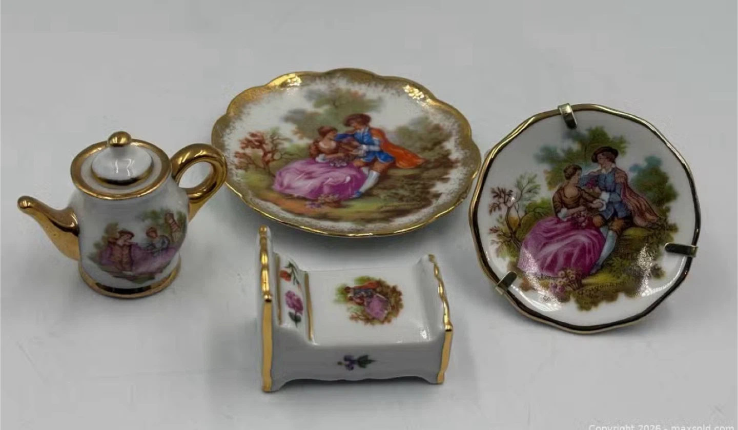 Selling a charming miniature porcelain tea set by Limoges! This set includes a teapot, a small bed, and two decorative plates, all adorned with delicate designs and gold accents. Perfect for collectors or as a unique decorative piece for your home!