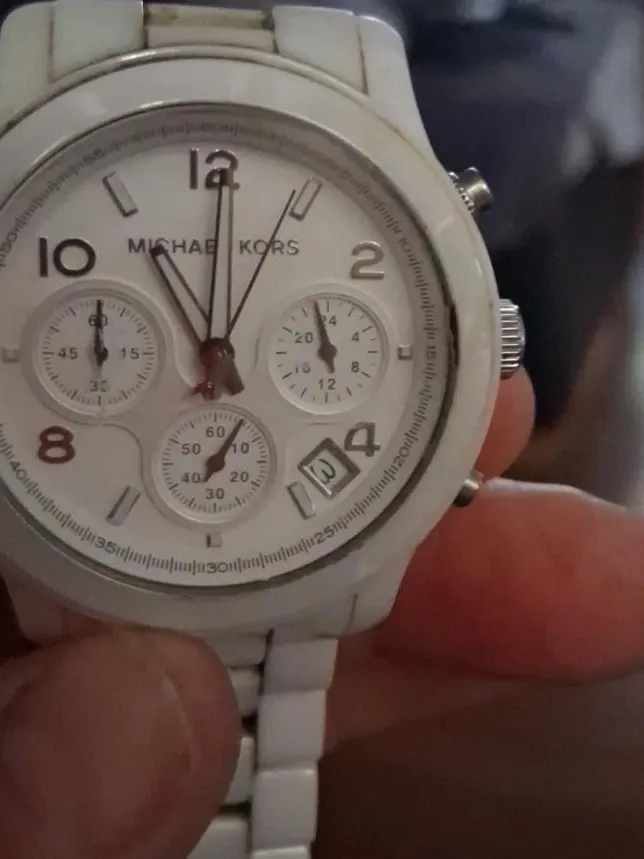 Selling a Michael Kors watch with a white band and face! It's in good condition. The watch face has chronograph subdials and a date window.