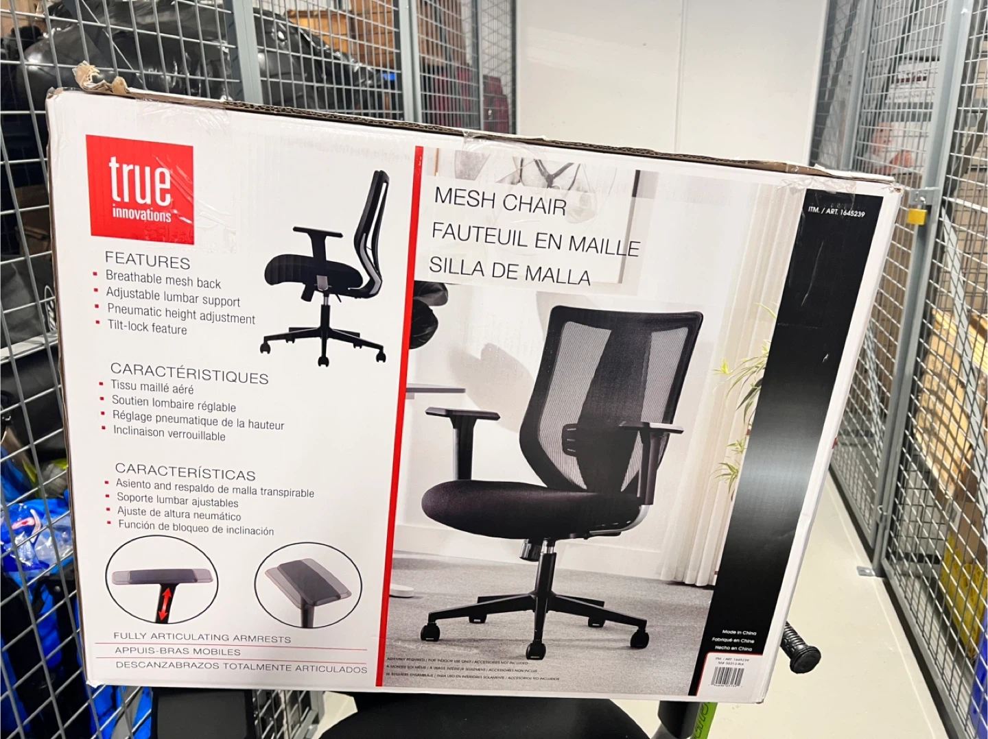 Selling a True Innovations mesh office chair. It features a breathable mesh back and adjustable lumbar support. It also has pneumatic height adjustment and a tilt-lock feature. There is a small crack on one of the armrests.