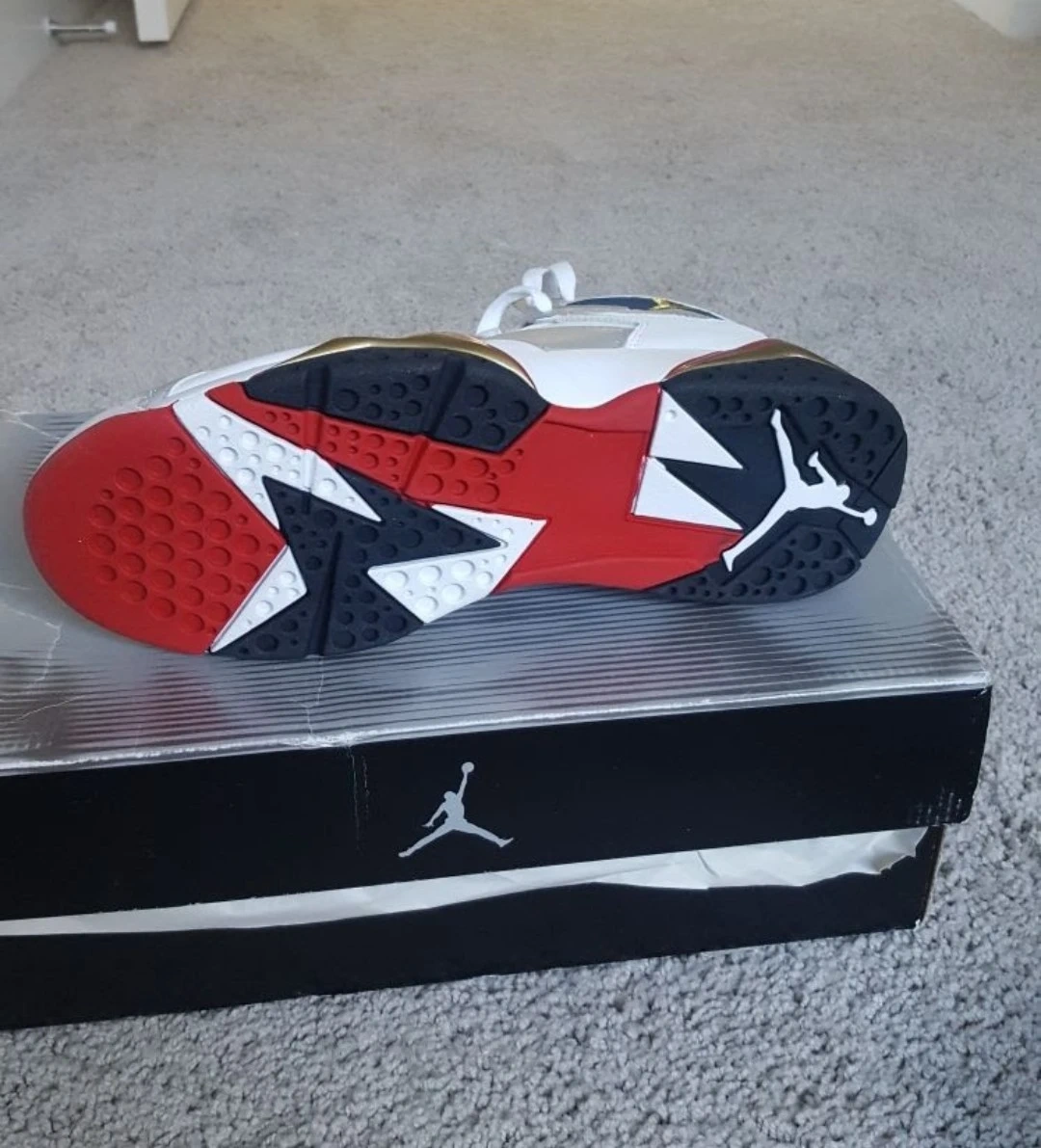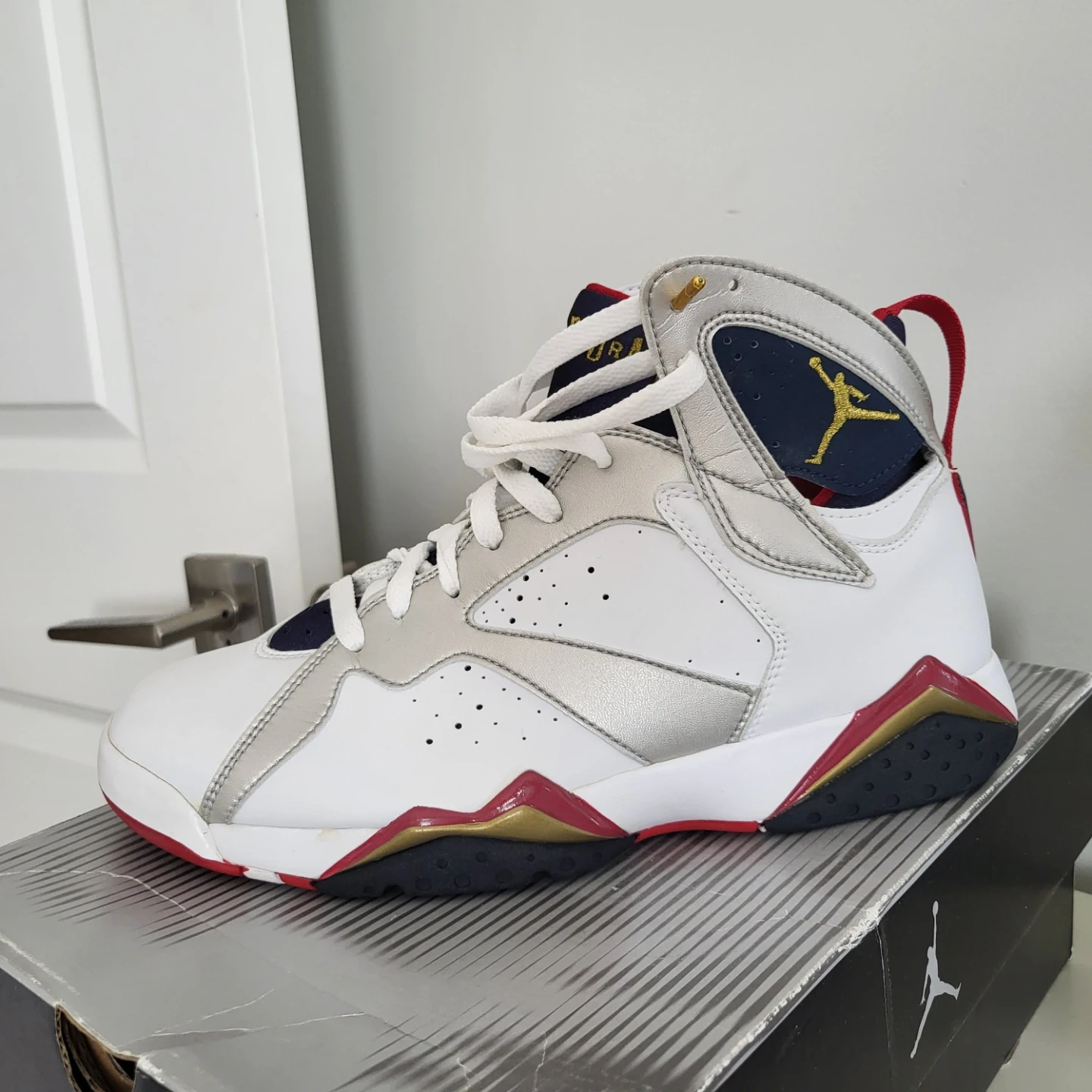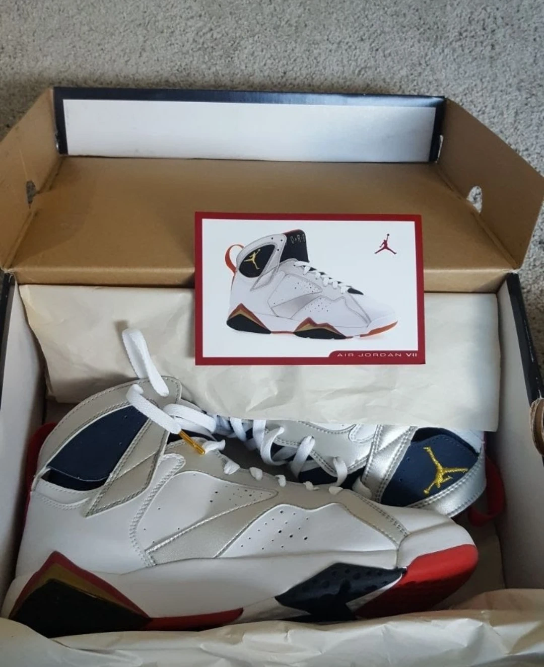 Selling a pair of Men's Air Jordan 7 Retro sneakers in size 8.5! The colourway is White/MT Gold-Mdn Navy-True Red. They come with the original box