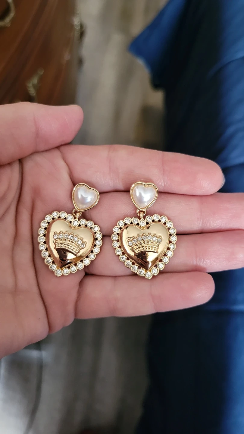 These are a pair of gold-tone heart drop earrings from Juicy Couture. They feature a heart design with a crown inside, surrounded by small rhinestones. The earrings have a pearl-like stud at the top.