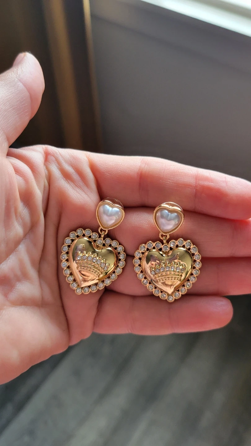 These are a pair of gold-tone heart drop earrings from Juicy Couture. They feature a heart design with a crown inside, surrounded by small rhinestones. The earrings have a pearl-like stud at the top.