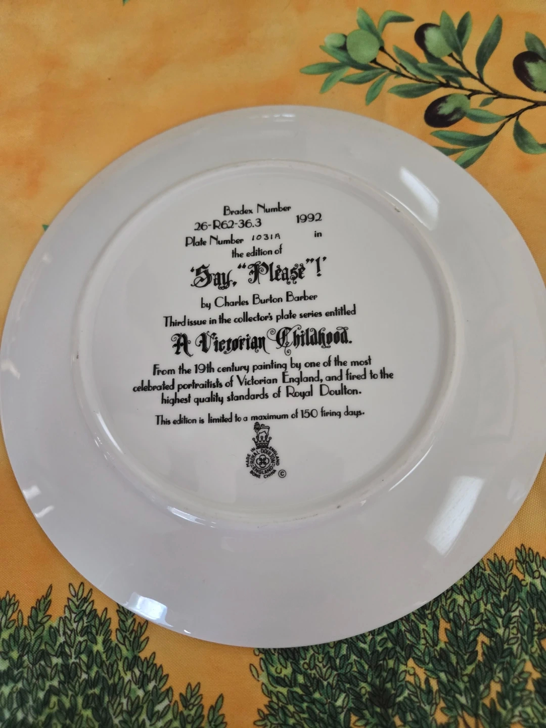 This is a collector's plate from the series "A Victorian Childhood", entitled "Say, 'Please'". It's the third issue in the series, painted by Charles Burton Barber. Made in 1992, it's a beautiful piece of art!