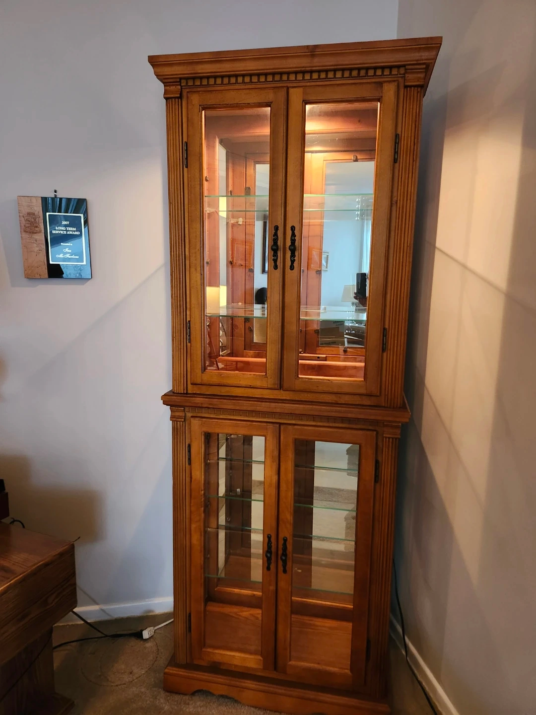 Here's a lovely wooden display cabinet, perfect for showcasing your favourite items! It features glass doors on both the upper and lower sections, allowing for easy viewing. The cabinet is in great condition and ready to add a touch of elegance to your home