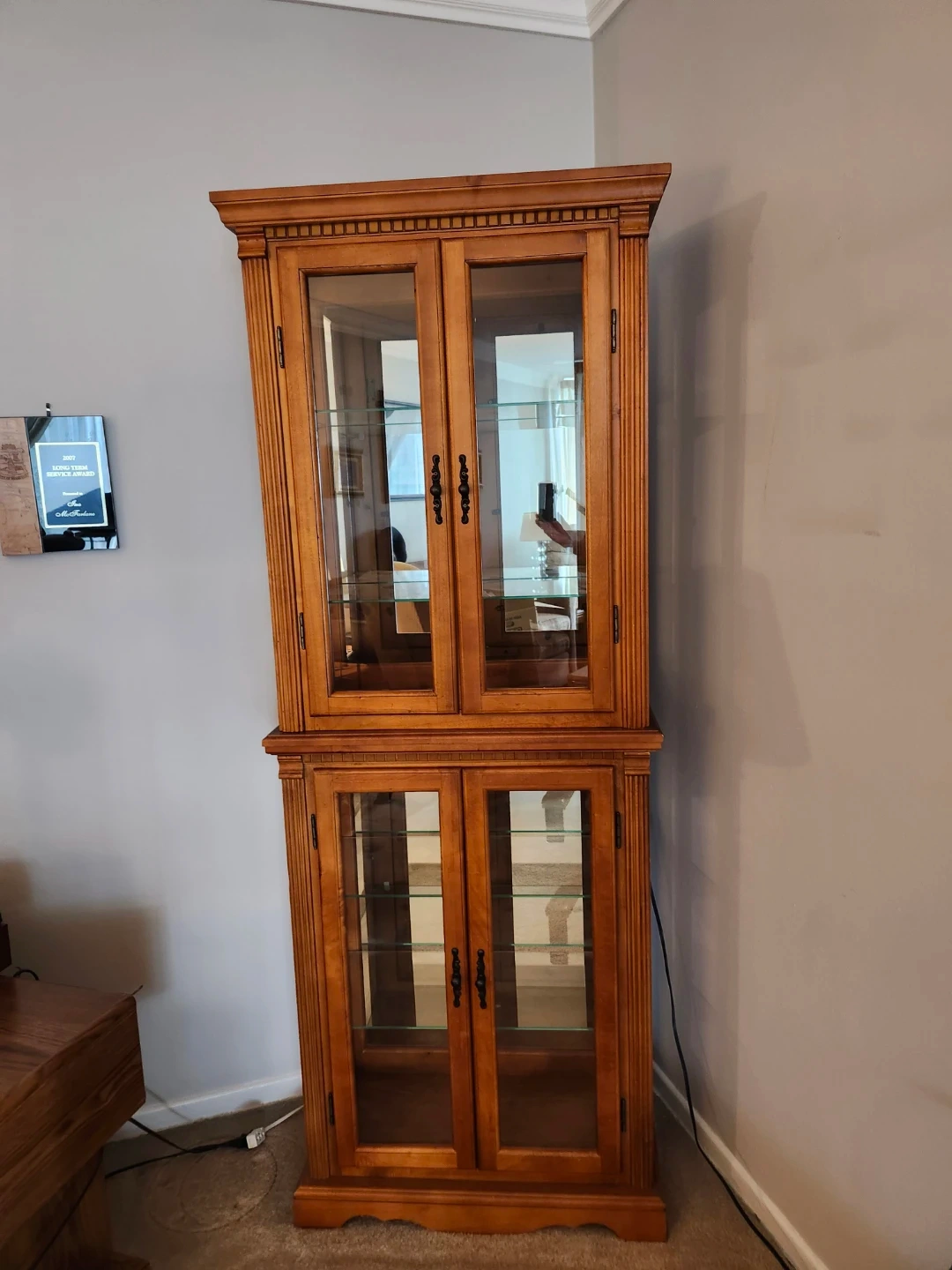 Here's a lovely wooden display cabinet, perfect for showcasing your favourite items! It features glass doors on both the upper and lower sections, allowing for easy viewing. The cabinet is in great condition and ready to add a touch of elegance to your home