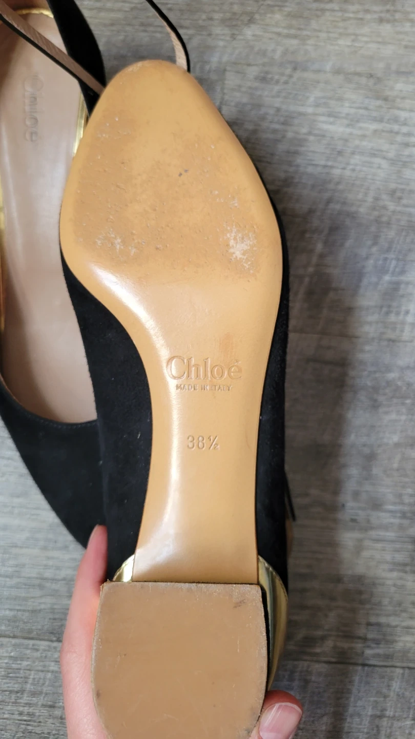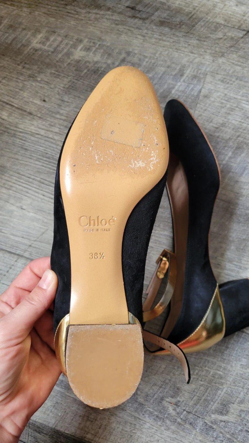 These Chloé block heel shoes are a stylish addition to any wardrobe! They feature a sleek black suede design with gold accents. Perfect for dressing up or down, these shoes are a size 7 and in great condition