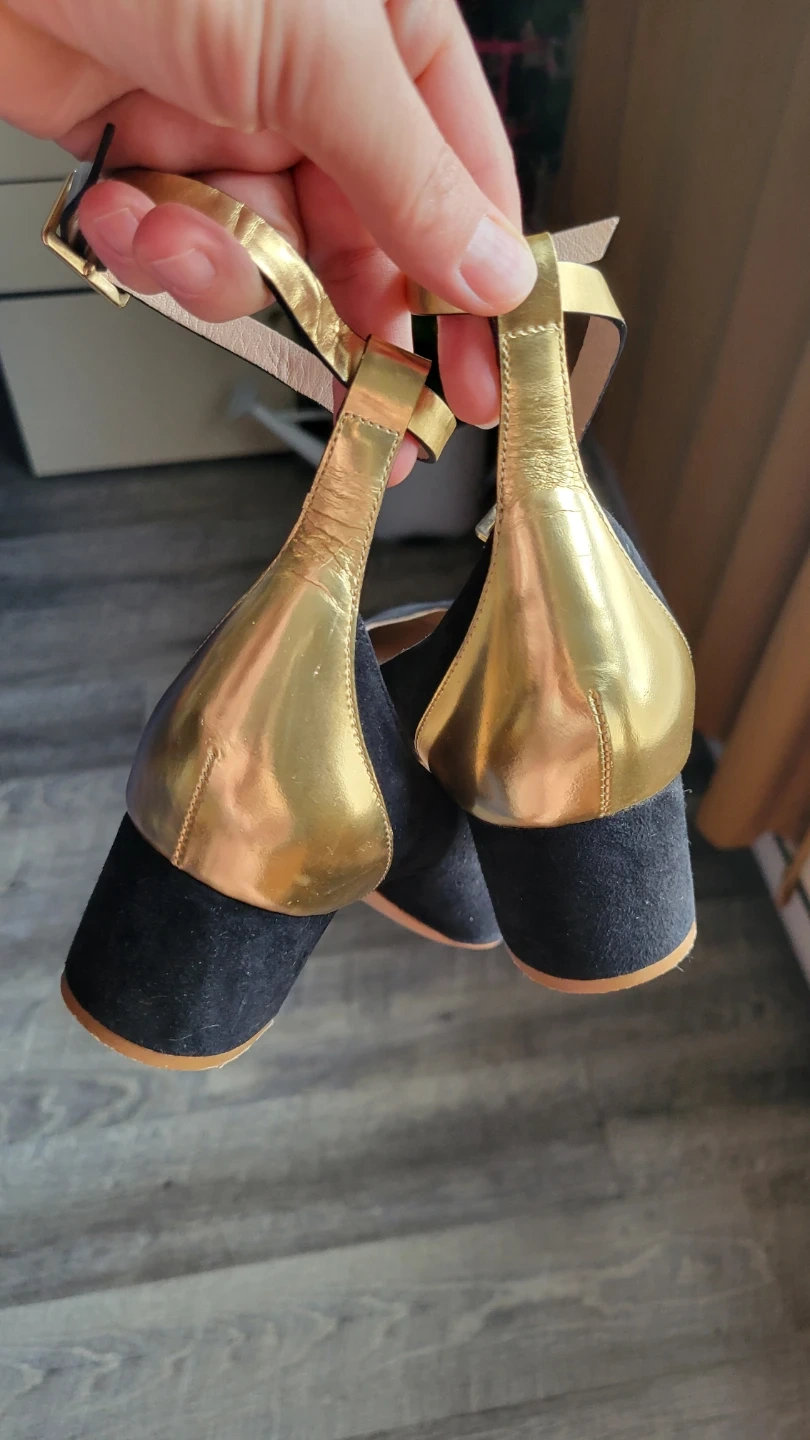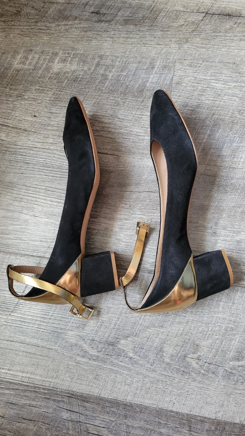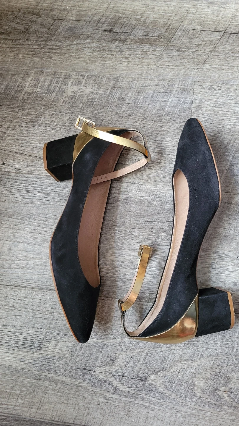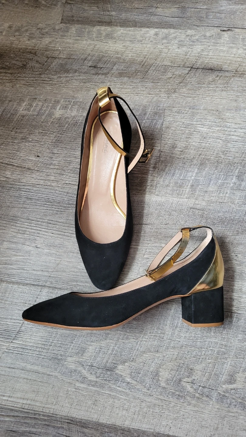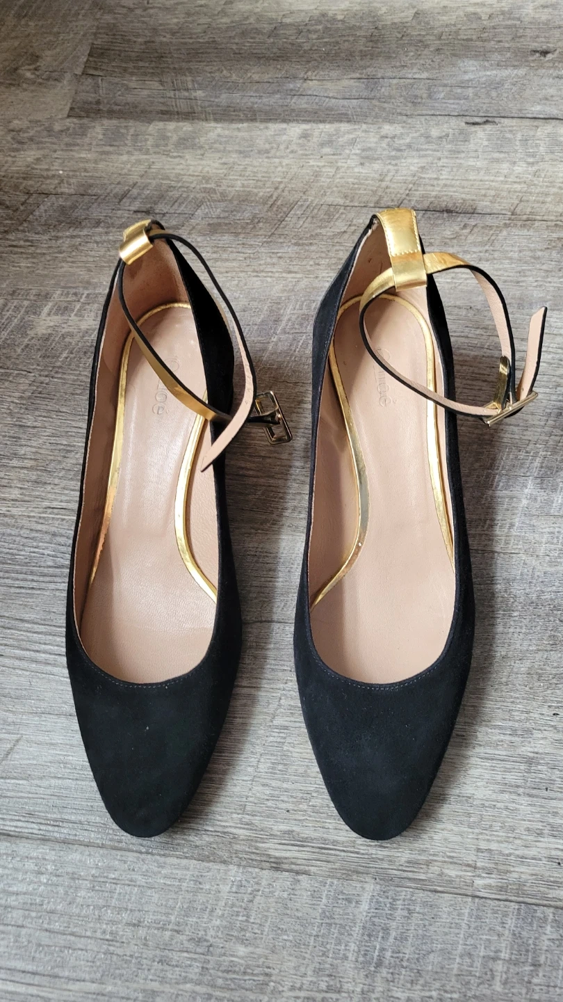 These Chloé block heel shoes are a stylish addition to any wardrobe! They feature a sleek black suede design with gold accents. Perfect for dressing up or down, these shoes are a size 7 and in great condition