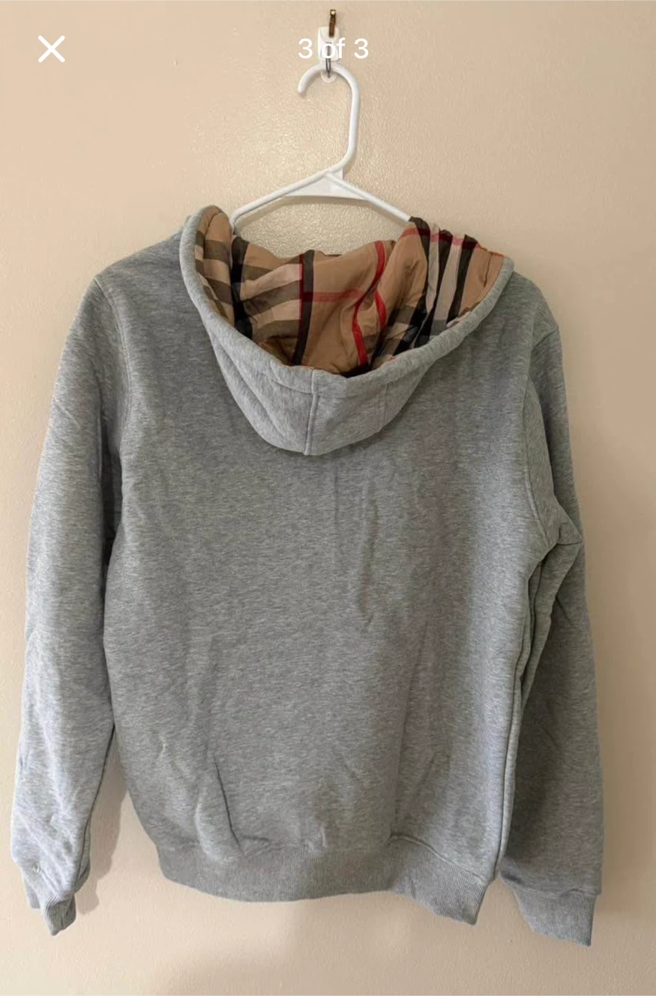 Selling a Burberry grey hoodie. The inside of the hood has the classic Burberry plaid design. It's in great condition and ready for a new home!