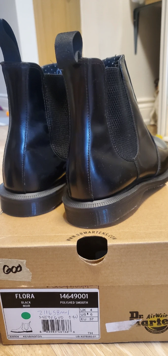 Selling a pair of Dr. Martens Flora Chelsea boots in black. They're a polished smooth style and in great condition. The size is US 6, UK 4, EU 37. Comes with the original box!