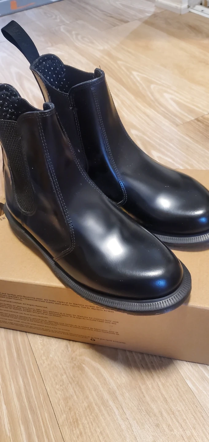 Selling a pair of Dr. Martens Flora Chelsea boots in black. They're a polished smooth style and in great condition. The size is US 6, UK 4, EU 37. Comes with the original box!
