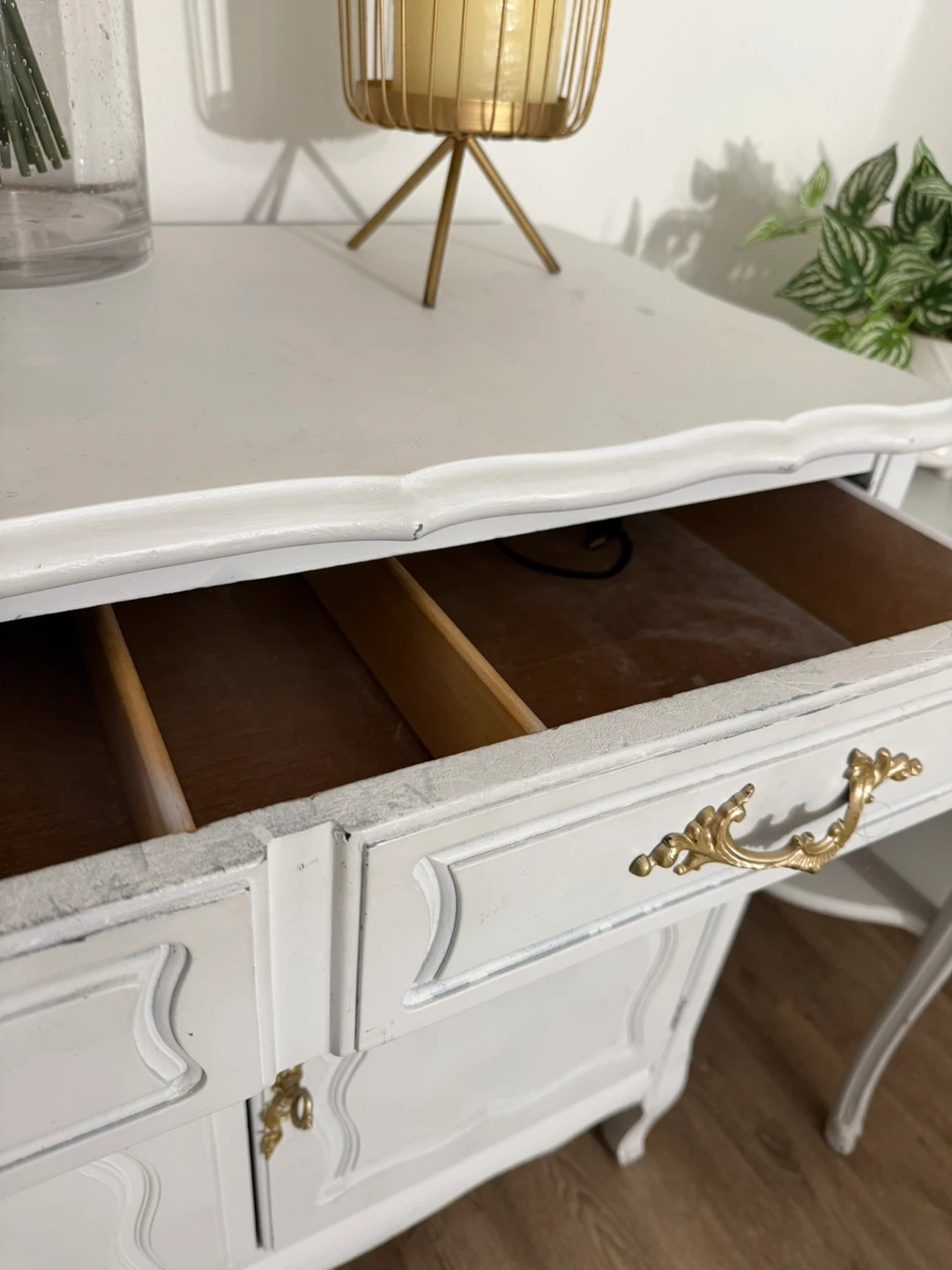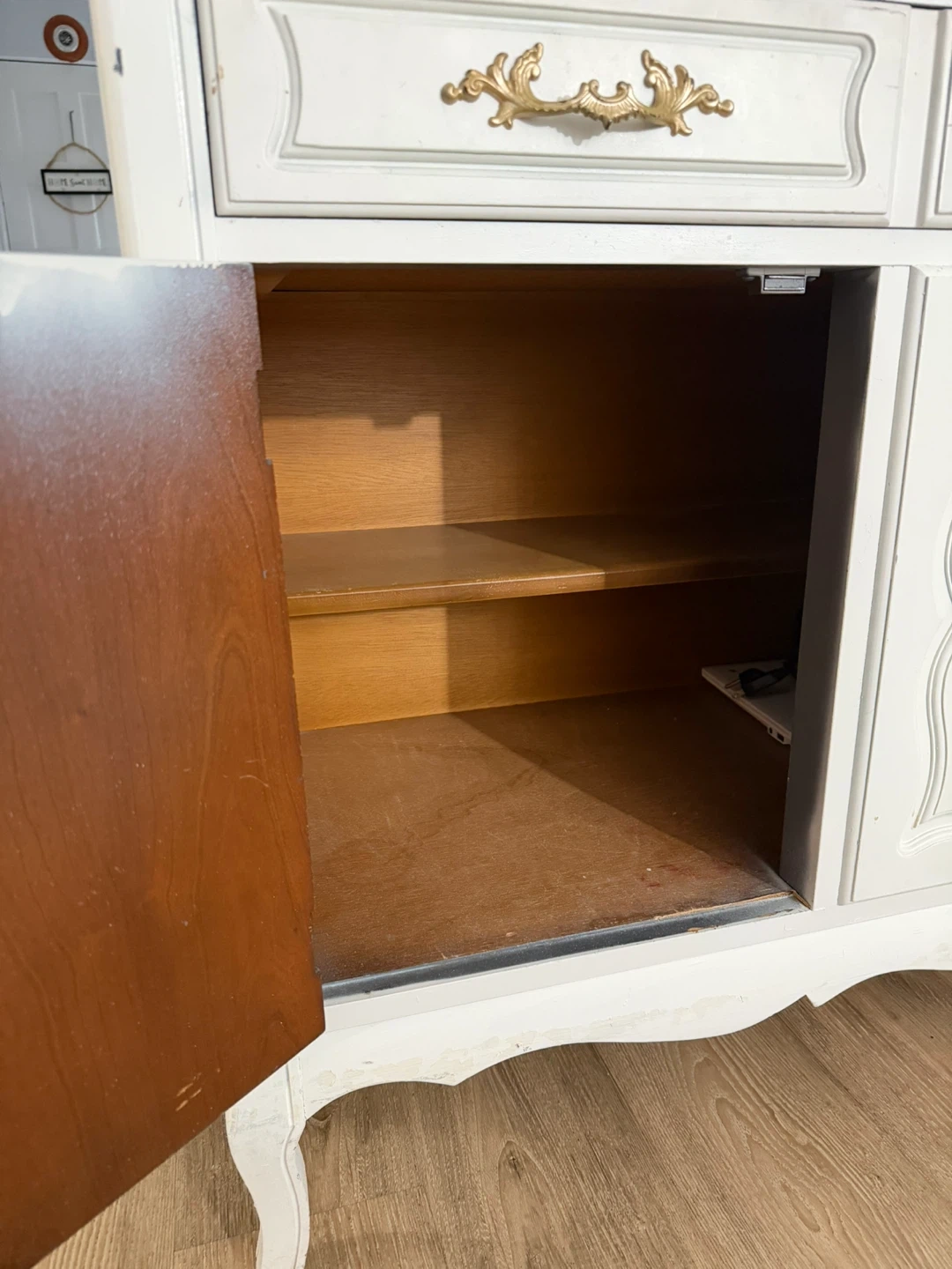 Selling a charming sideboard with a lovely antique-style design! It features ornate gold-tone handles and a classic white finish. It has some wear and tear.
