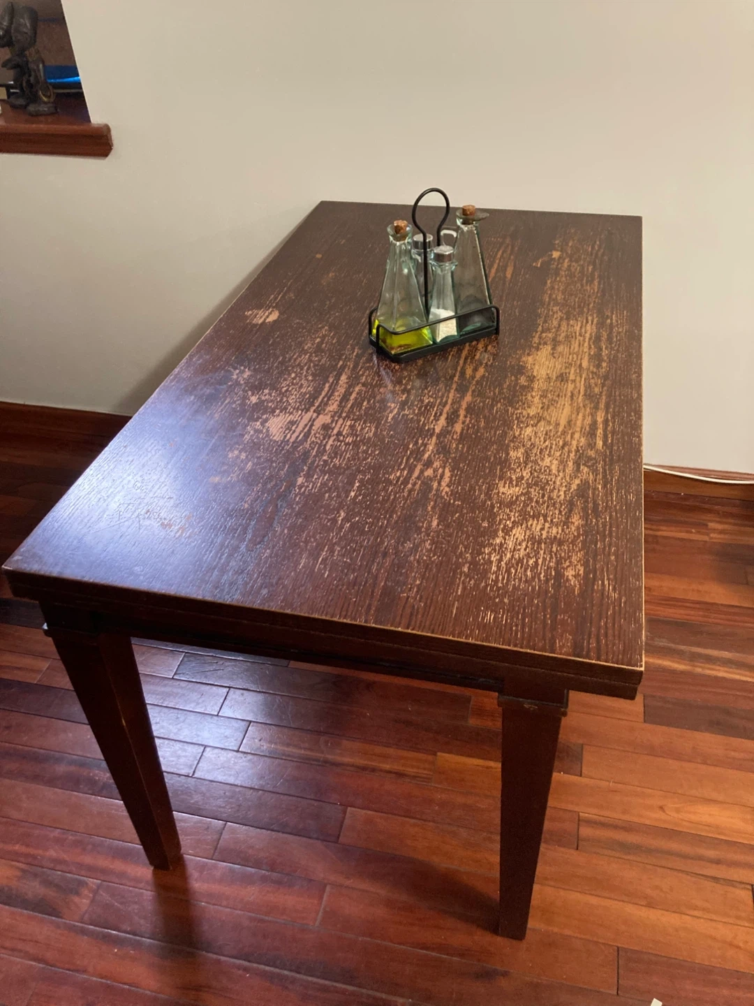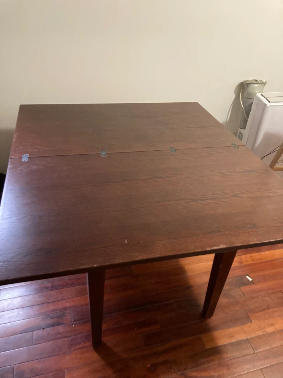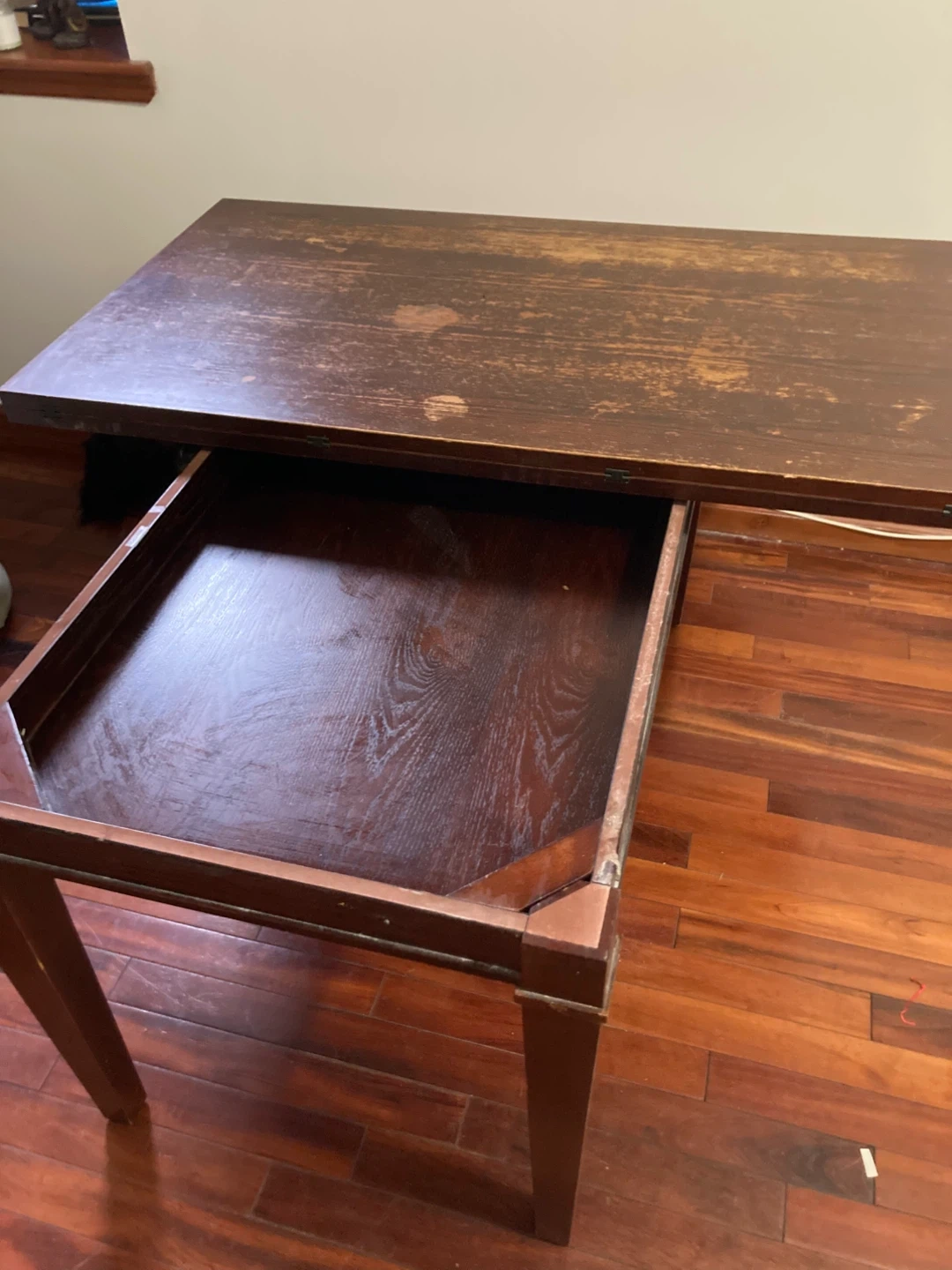 Selling much loved Crate and Barrel wood table that pivots and opens to expand from 6 to 10+/- seats. Internal storage. Give me an offer!