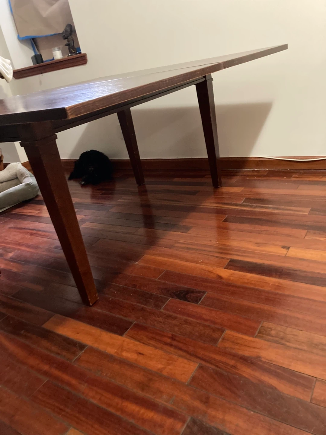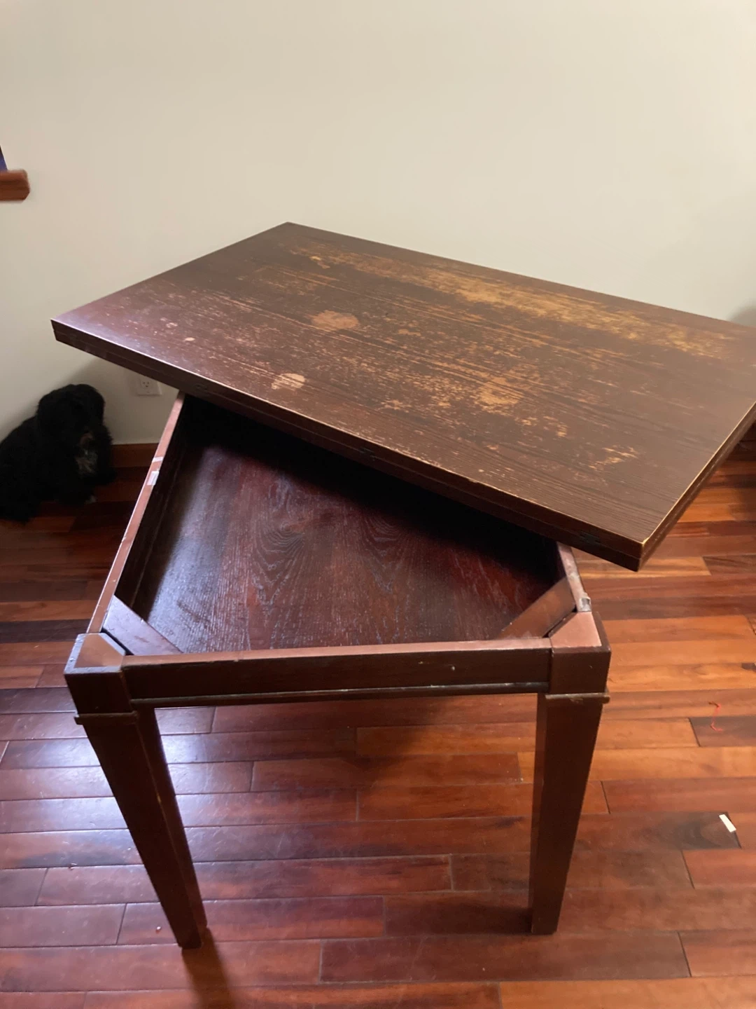 Selling much loved Crate and Barrel wood table that pivots and opens to expand from 6 to 10+/- seats. Internal storage. Give me an offer!