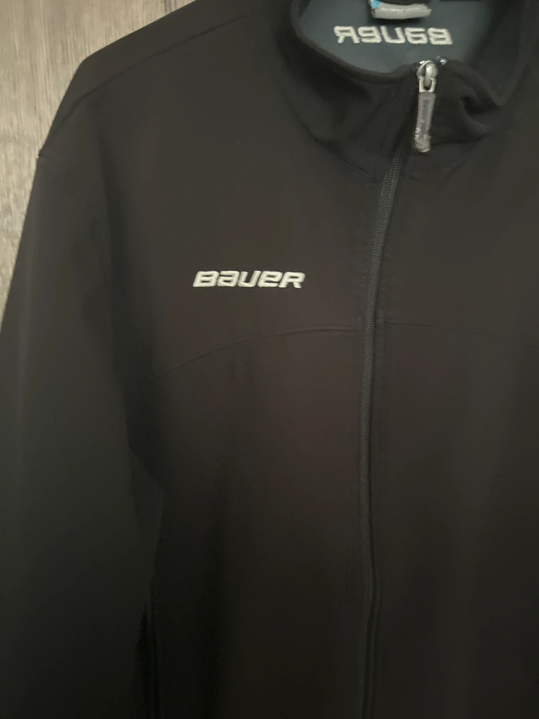 Selling a Bauer jacket with Crown Royal branding. It's black and features the Bauer logo on the front and back, along with the Crown Royal logo near the bottom. Great for any hockey fan!
