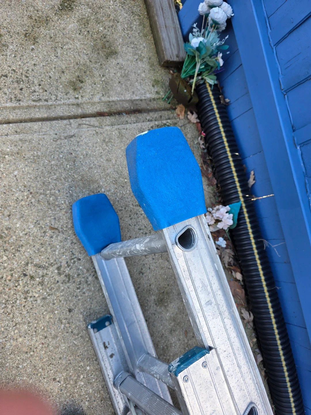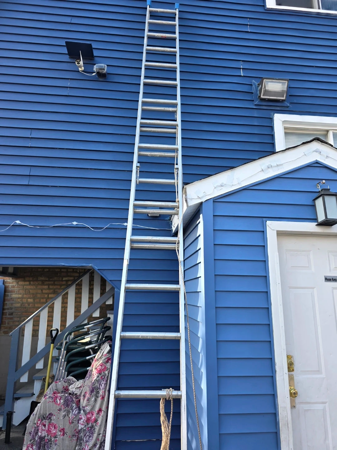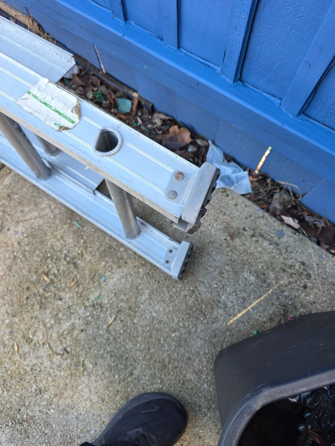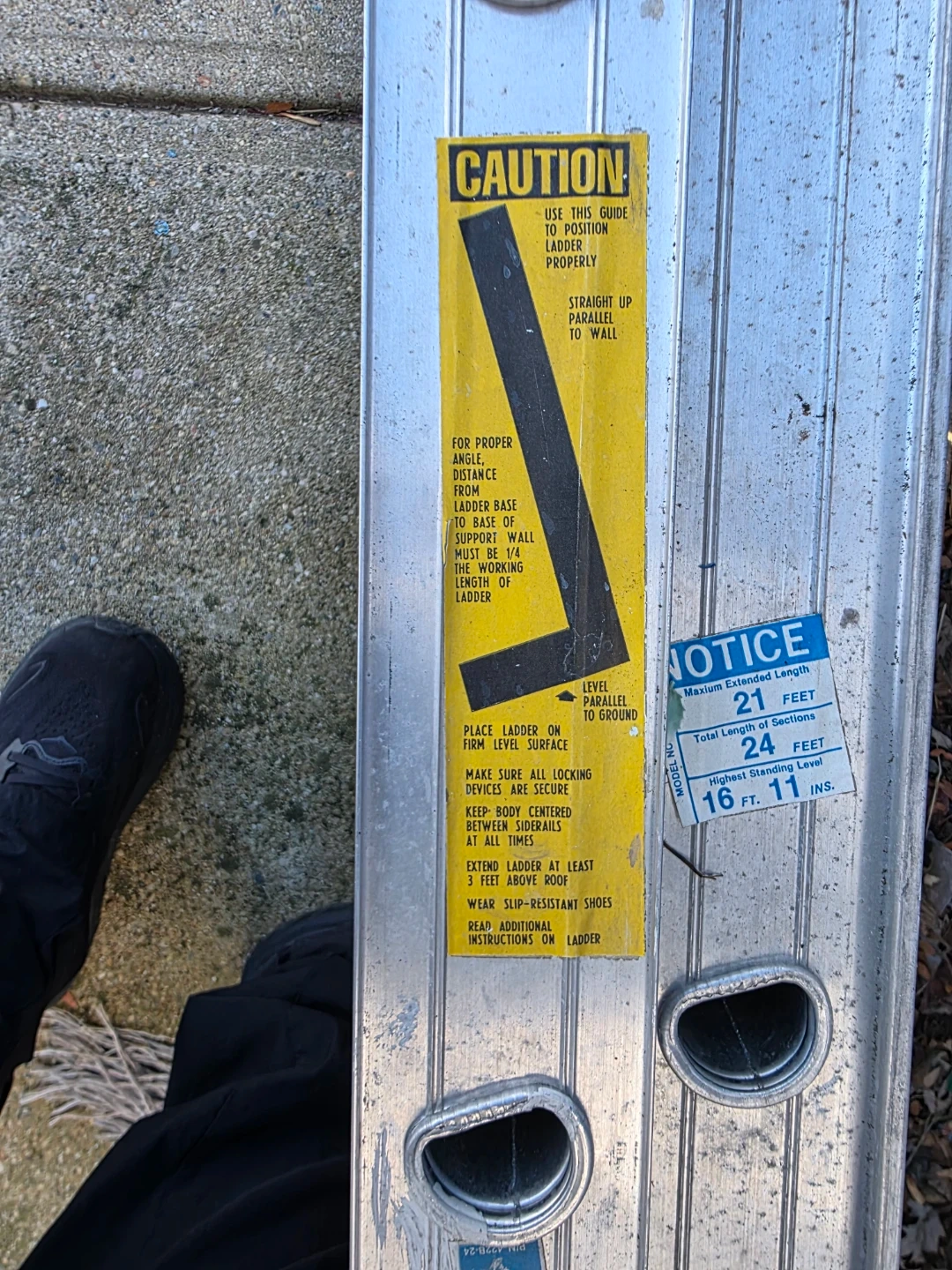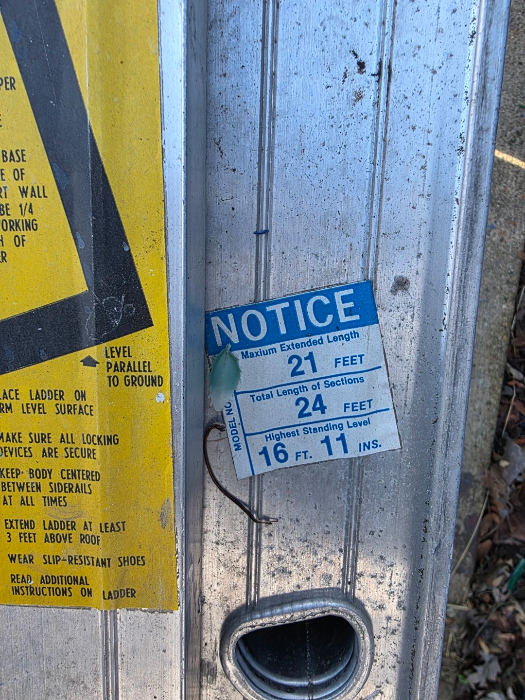 Selling a 24-foot aluminum extension ladder. The maximum extended length is 21 feet, and the highest standing level is 16 feet 11 inches. It has blue foam on the top.