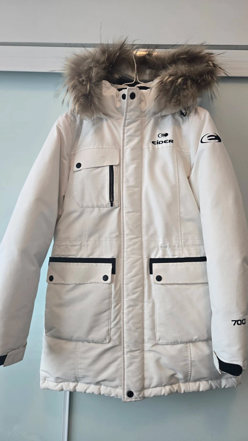 Selling a white down jacket from Eider! It has a furry hood and several pockets. The jacket is marked with '700', indicating the fill power of the down. Great for staying warm this winter!