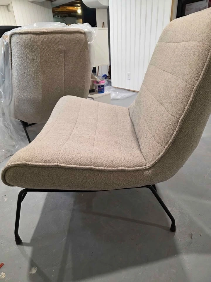 Soft, textured bouclé fabric with black metal legs. Sturdy, stylish and comfortable — perfect for a living room, bedroom, office, or studio space.