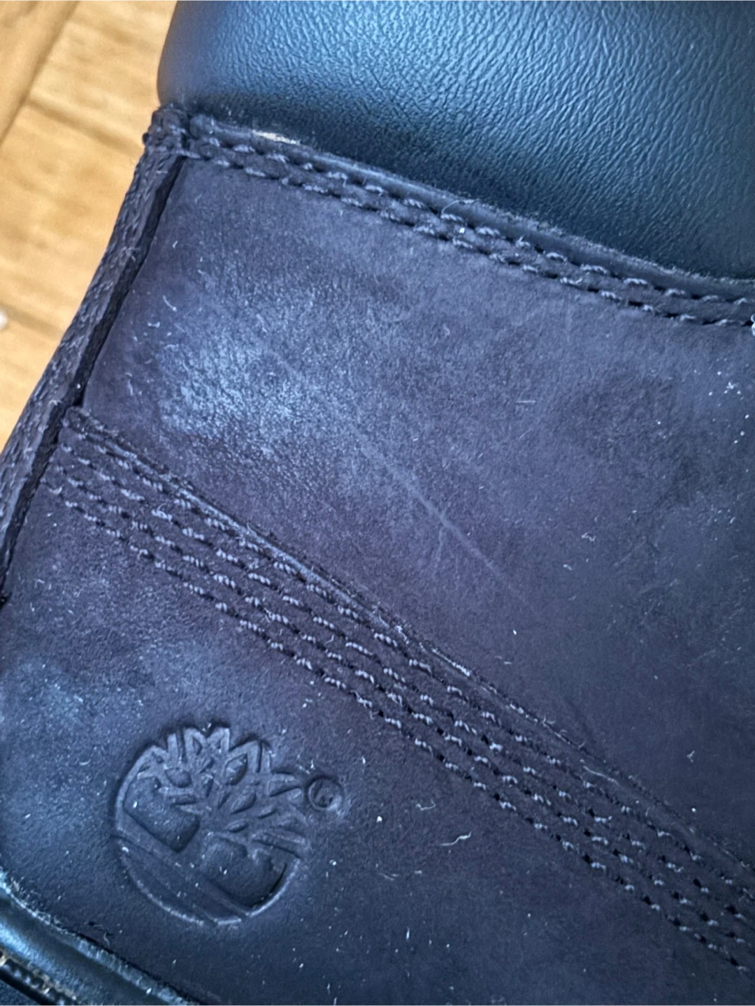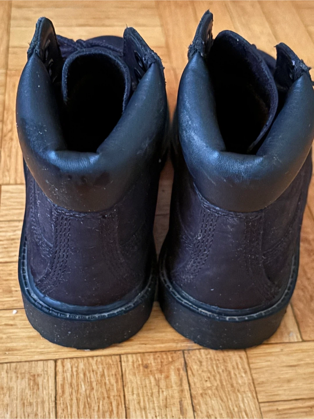 These are a pair of Timberland toddler boots in black, size 12 US. They show some signs of wear but are still in good condition for your little one to explore in!