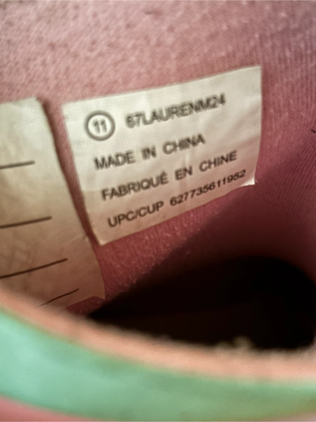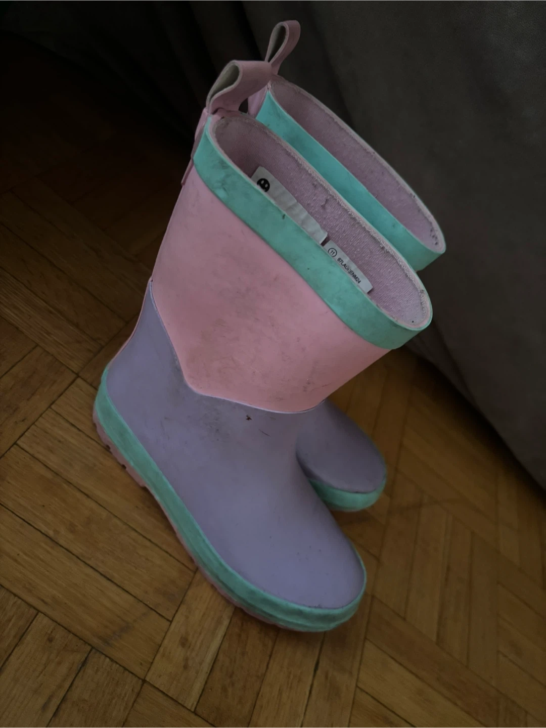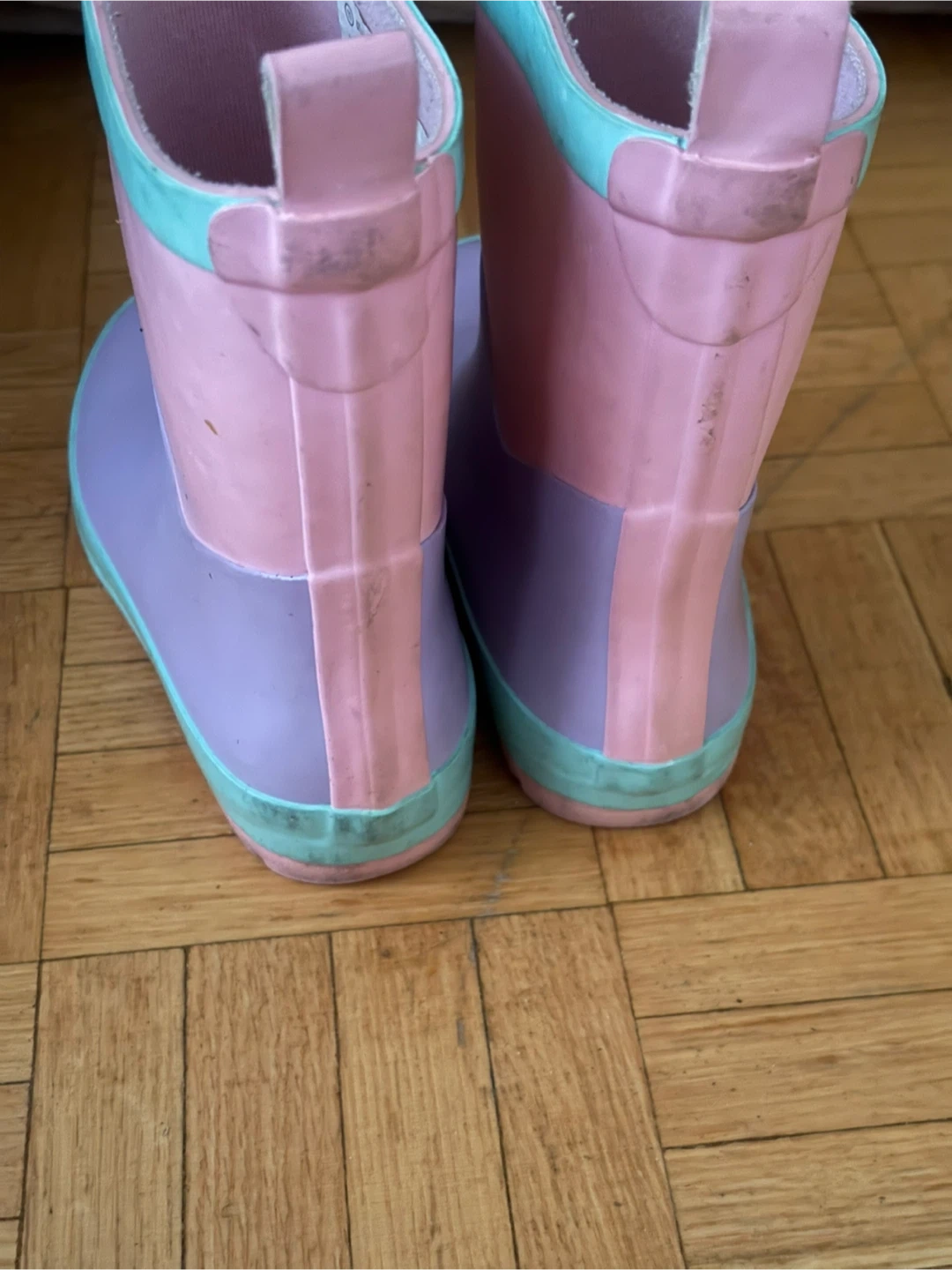 These cute Lauren + Lauren rain boots are in good condition and ready for some puddle jumping! They feature a fun colour block design with pink, purple, and mint green accents. Size 11