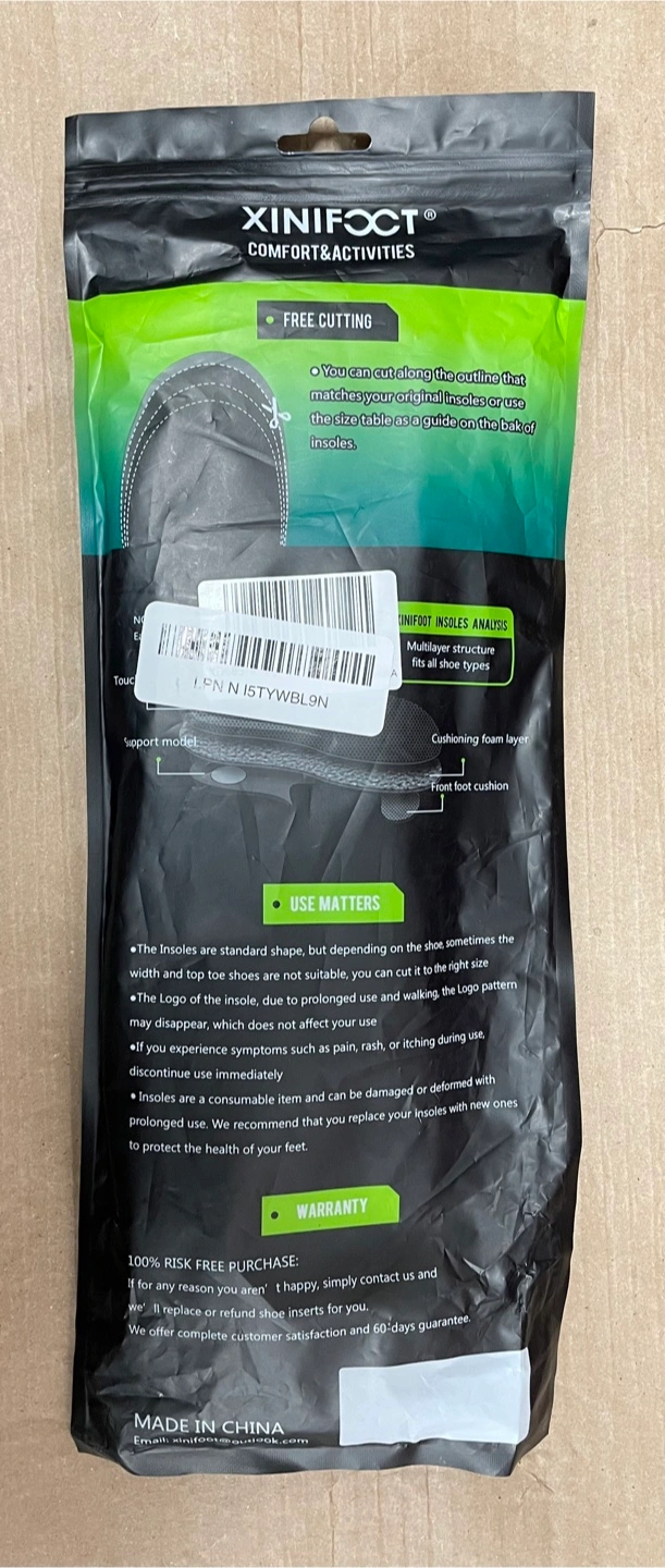 I have a new package of Xinifoot Comfort Insoles for sale! These insoles are designed for comfort and activities, perfect for sports shoes, outdoor shoes, lace-up shoes, and work boots. They are free cutting, so you can cut along the outline that matches your original insoles, using the insole as a guide. The insoles are standard shape, but depending on the shoe, sometimes the width and toe shape are not suitable, so you can cut it to the right size. They also have a multilayer structure that fits all shoe types and provides cushioning.