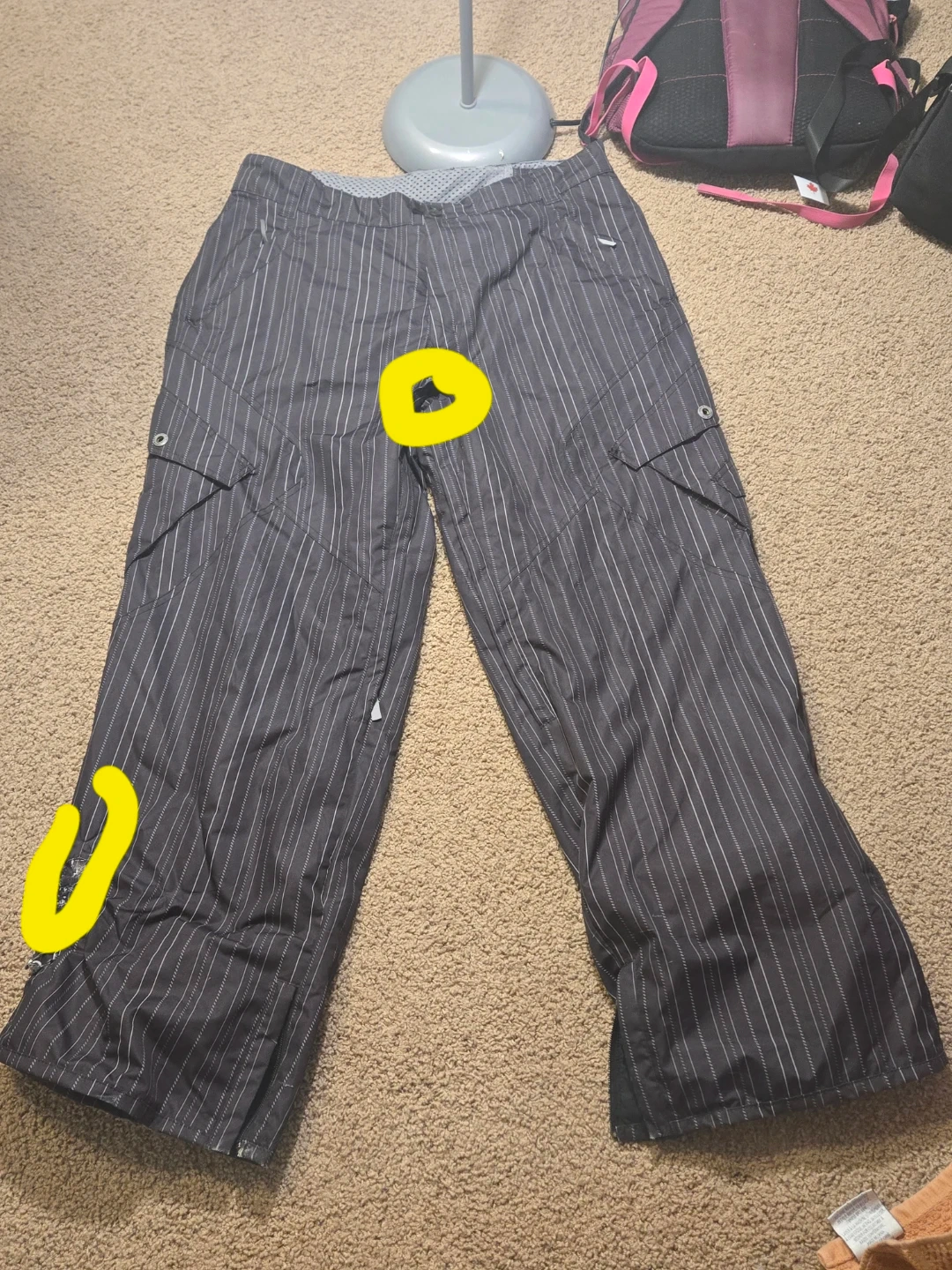 The snowpants have small holes in the marked areas