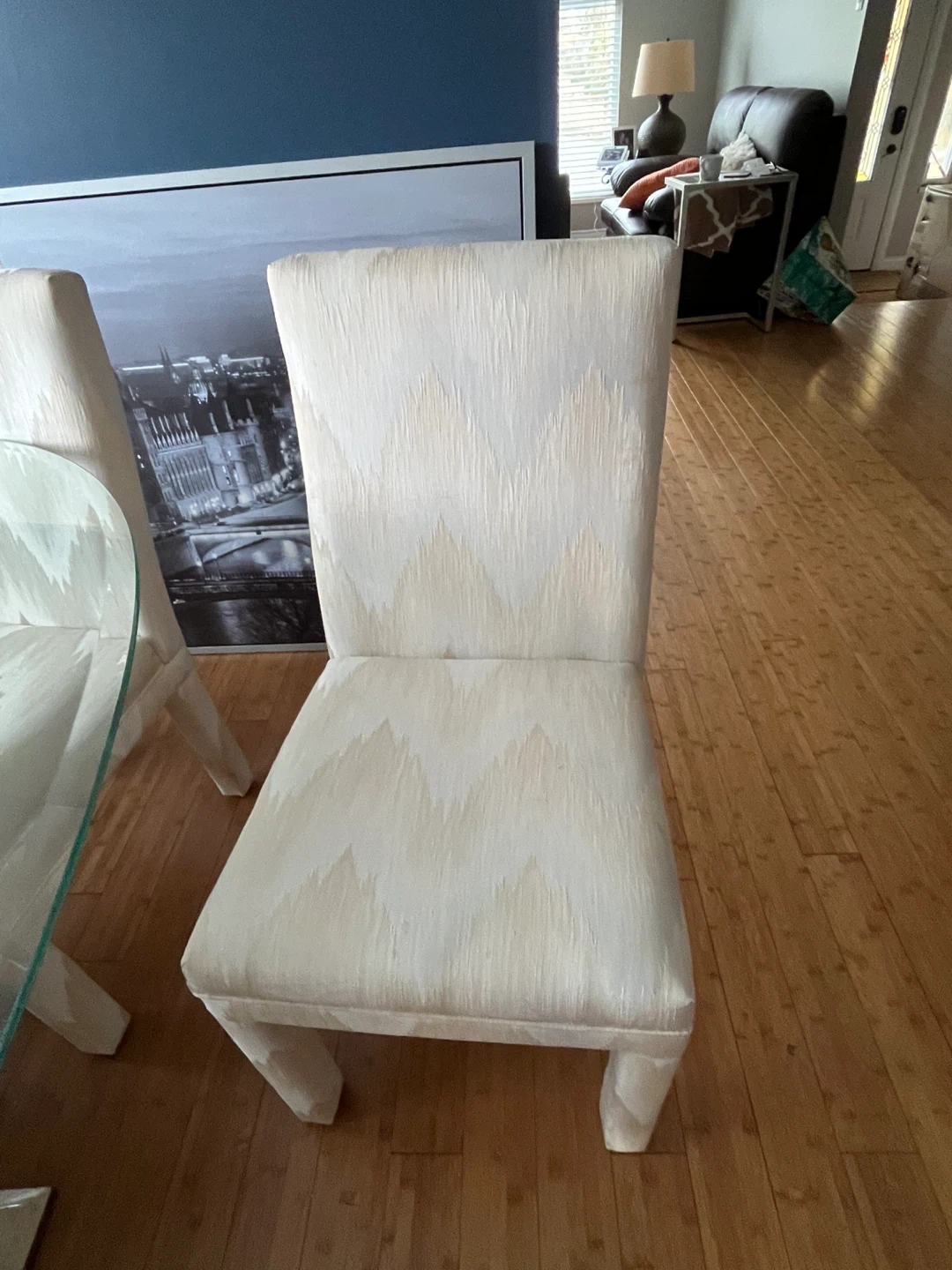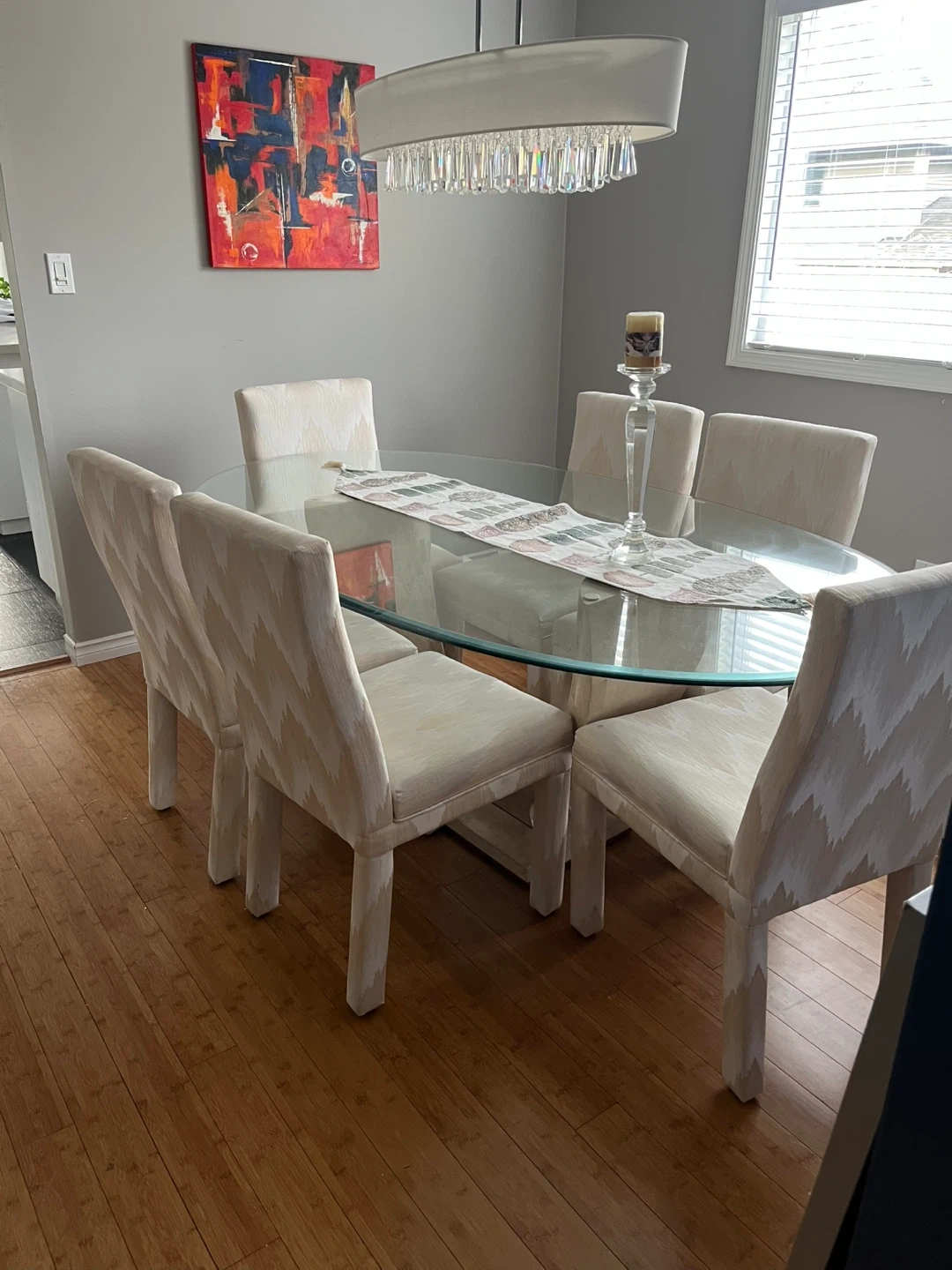 Selling a glass oval dining table with six matching chairs. The table has a unique wishbone base made from fossil stone and the chairs are upholstered in a patterned cream fabric. It's a stylish set that would look great in any dining room!