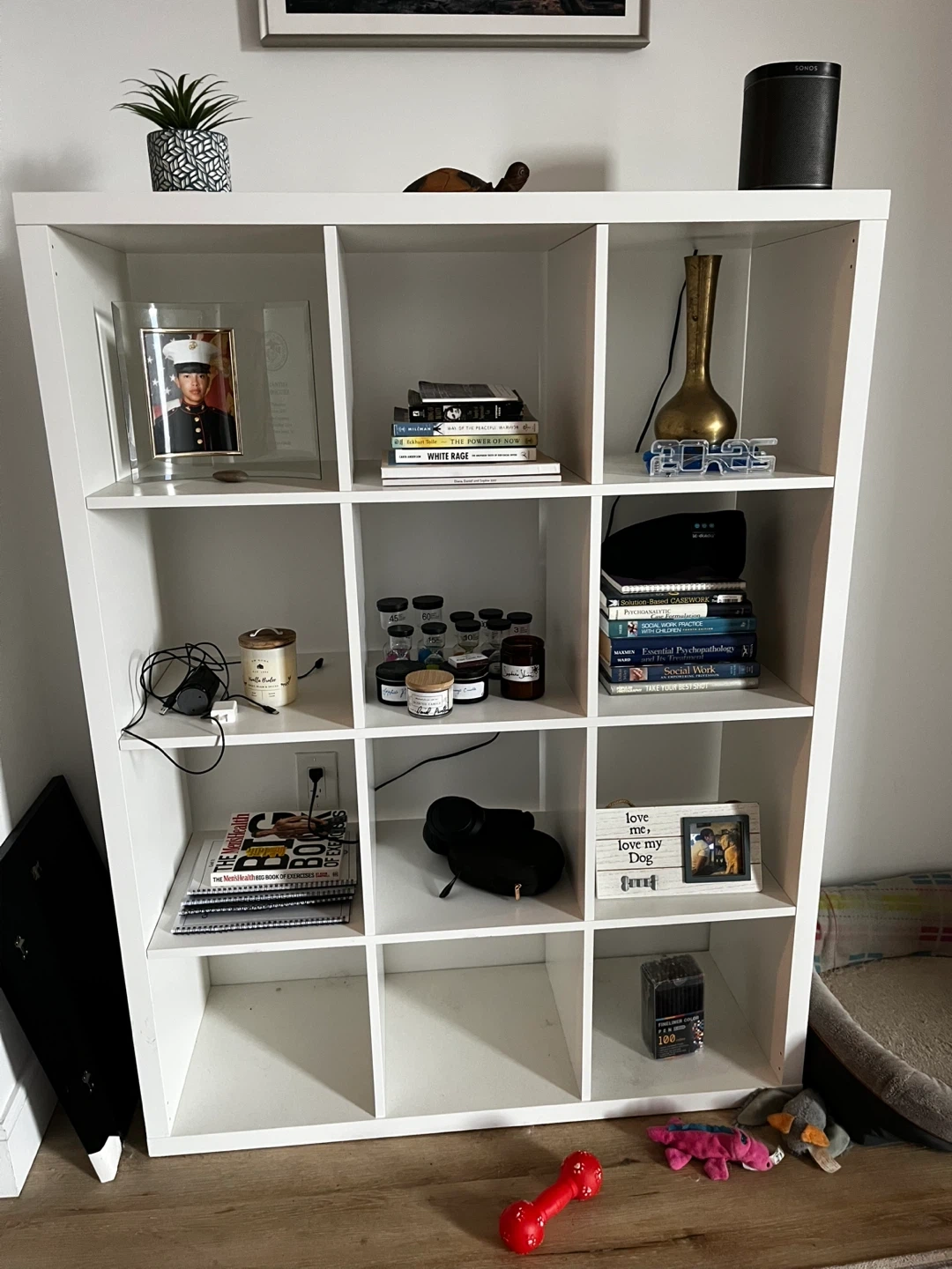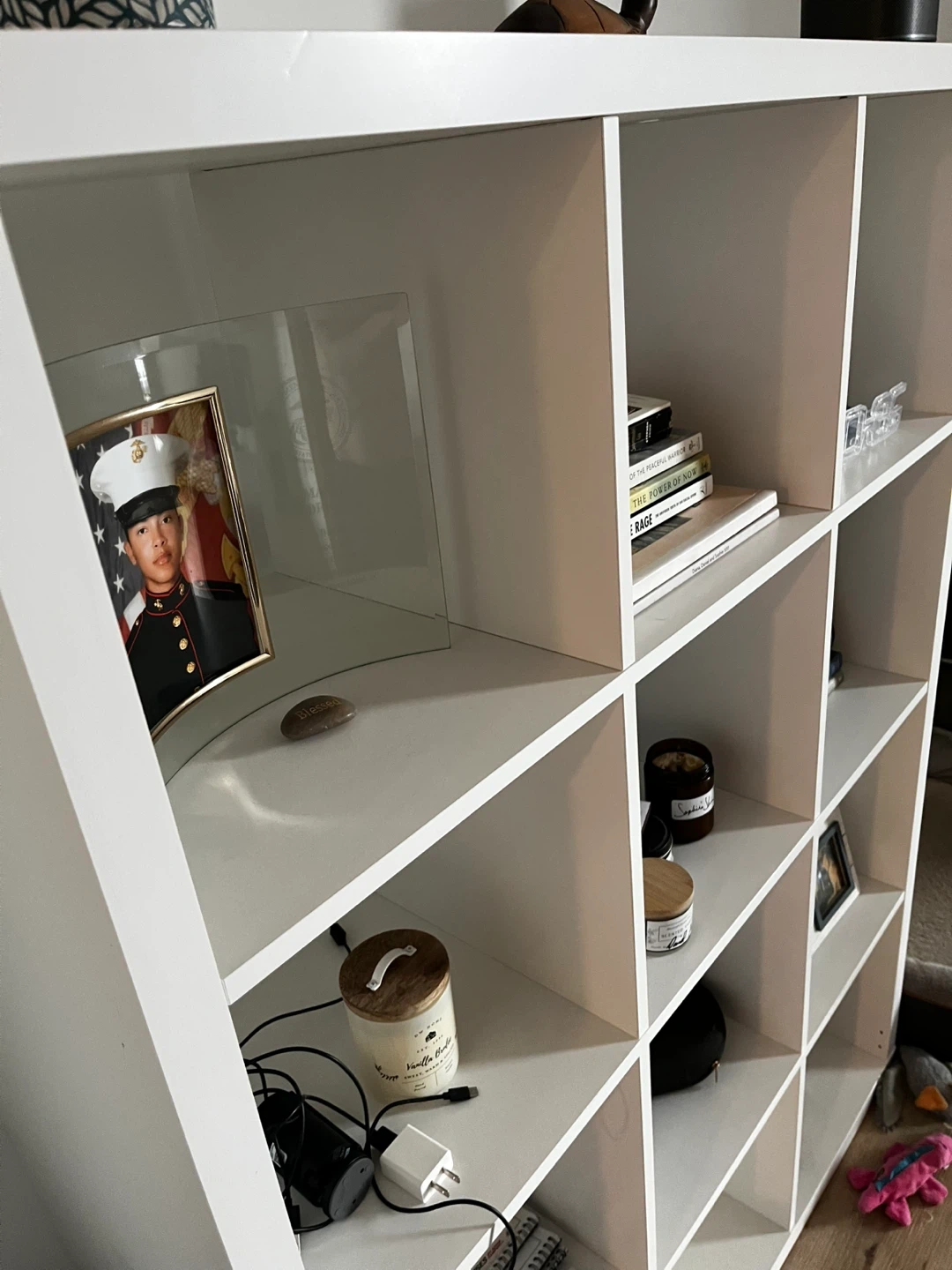 Selling a white shelving unit. It's in good condition and ready for a new home! Perfect for organizing books, decor, or anything else you need to store